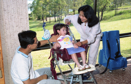 Two disability workers care for a child with special needs, the University of Newcastle, Australia - 1992