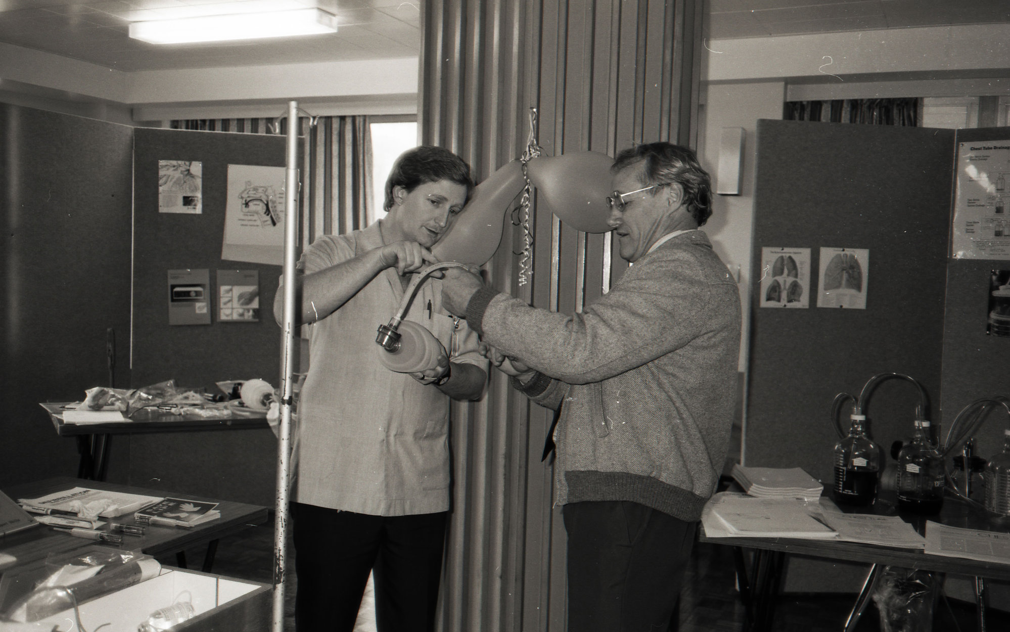 [Allan Smedley, left and Noel Carter, right] demonstrating how a piece of medical equipment works, Royal Newcastle Hospital, 1987