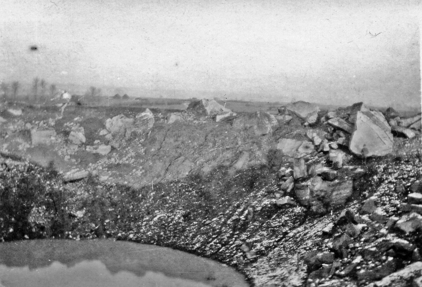 Crater left after ammunition magazine explosion (Fr) (note man in front of white rock)