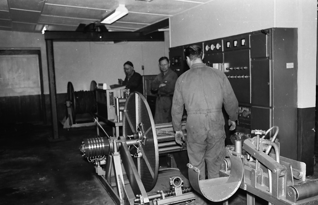 Two unidentified workers and Jack Keily (centre) in the new cable repair shop at Northern (Rhondda) Colliery, mid 1960s ([1960s]), [Rhondda123]. Living Histories, accessed 14/01/2026, https://livinghistories.newcastle.edu.au/nodes/view/18337