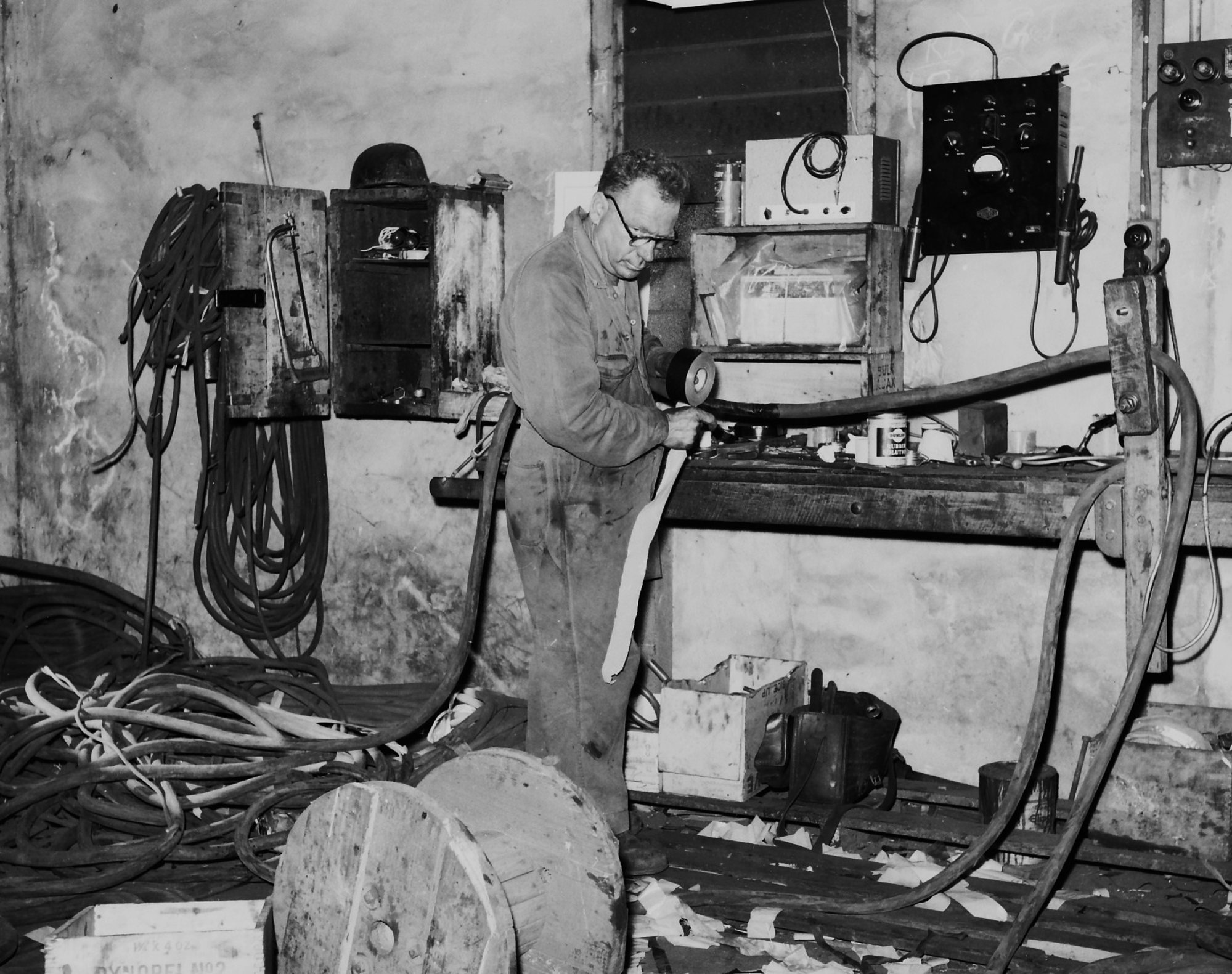 Howard, Barry, George Wilson working in the old cable repair room at Northern (Rhondda) Colliery, NSW, Australia, c. early 1960s, by Barry Howard ([1960s]), [Rhondda 69]. Living Histories, accessed 19/03/2026, https://livinghistories.newcastle.edu.au/nodes/view/18386