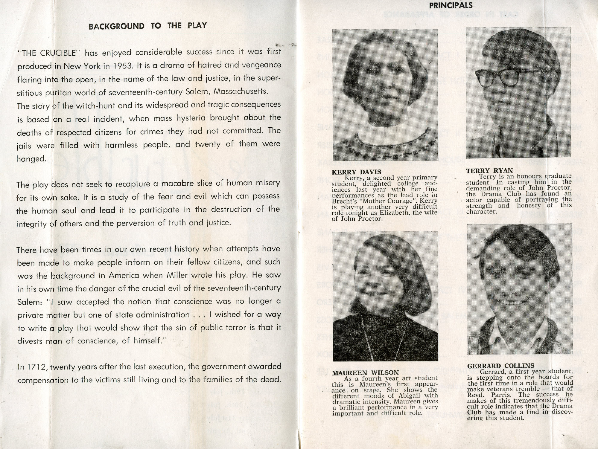 The Crucible - Programme (Page One) , Newcastle Teachers' College, NSW, Australia - c. 1968 (1968), [B16481-1968075a]. Living Histories, accessed 08/02/2026, https://livinghistories.newcastle.edu.au/nodes/view/19455