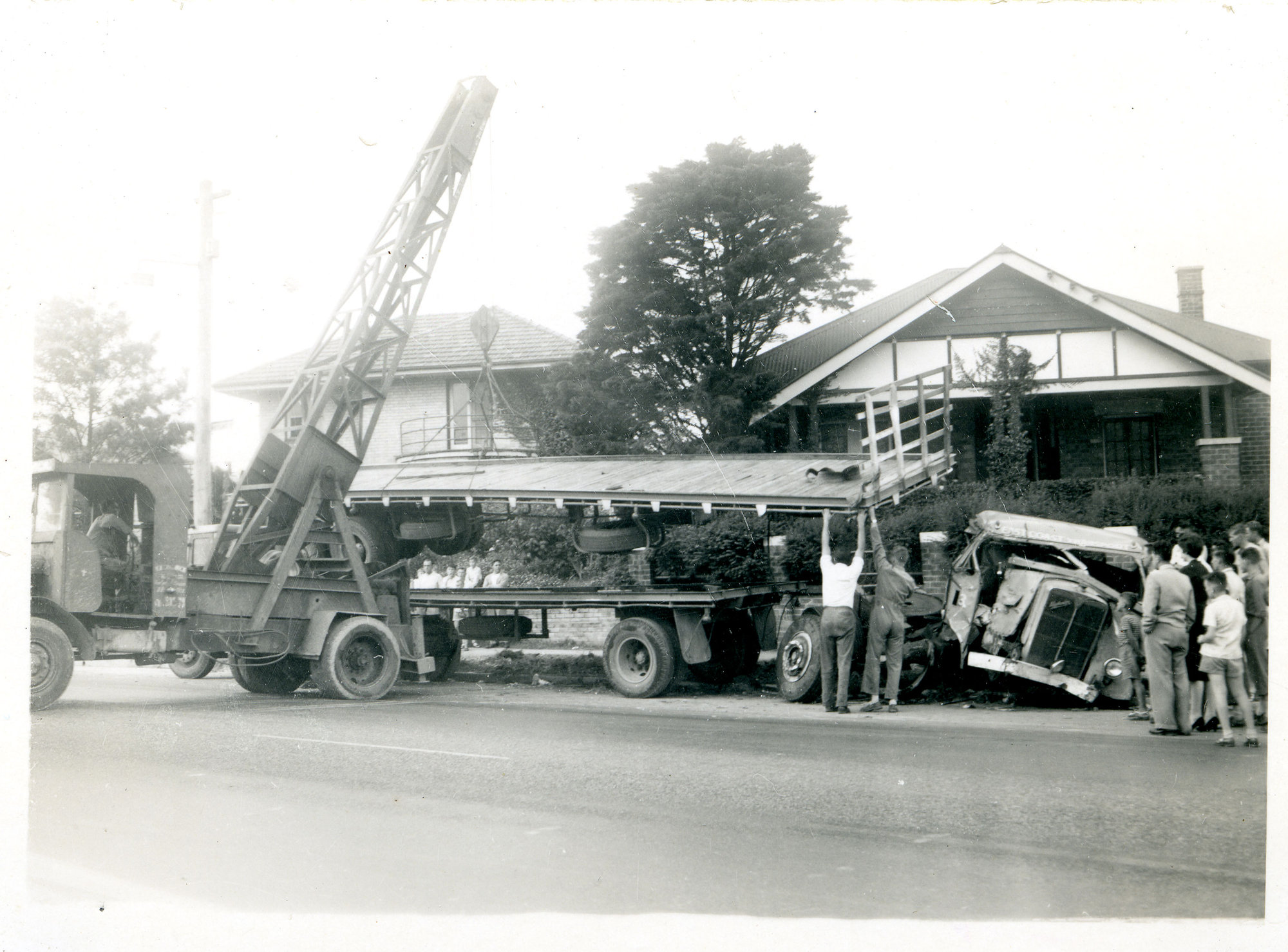 Truck accident near corner of Gamack Street and Maitland Road, Mayfield, NSW, c. 1950s