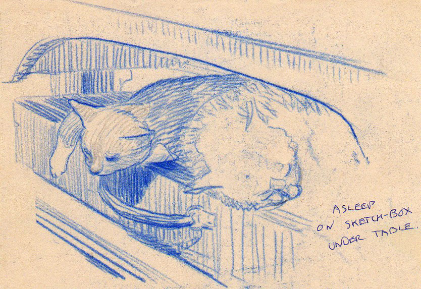 "Asleep on sketch-box under table" Sketch of a cat by Harry Pugmire