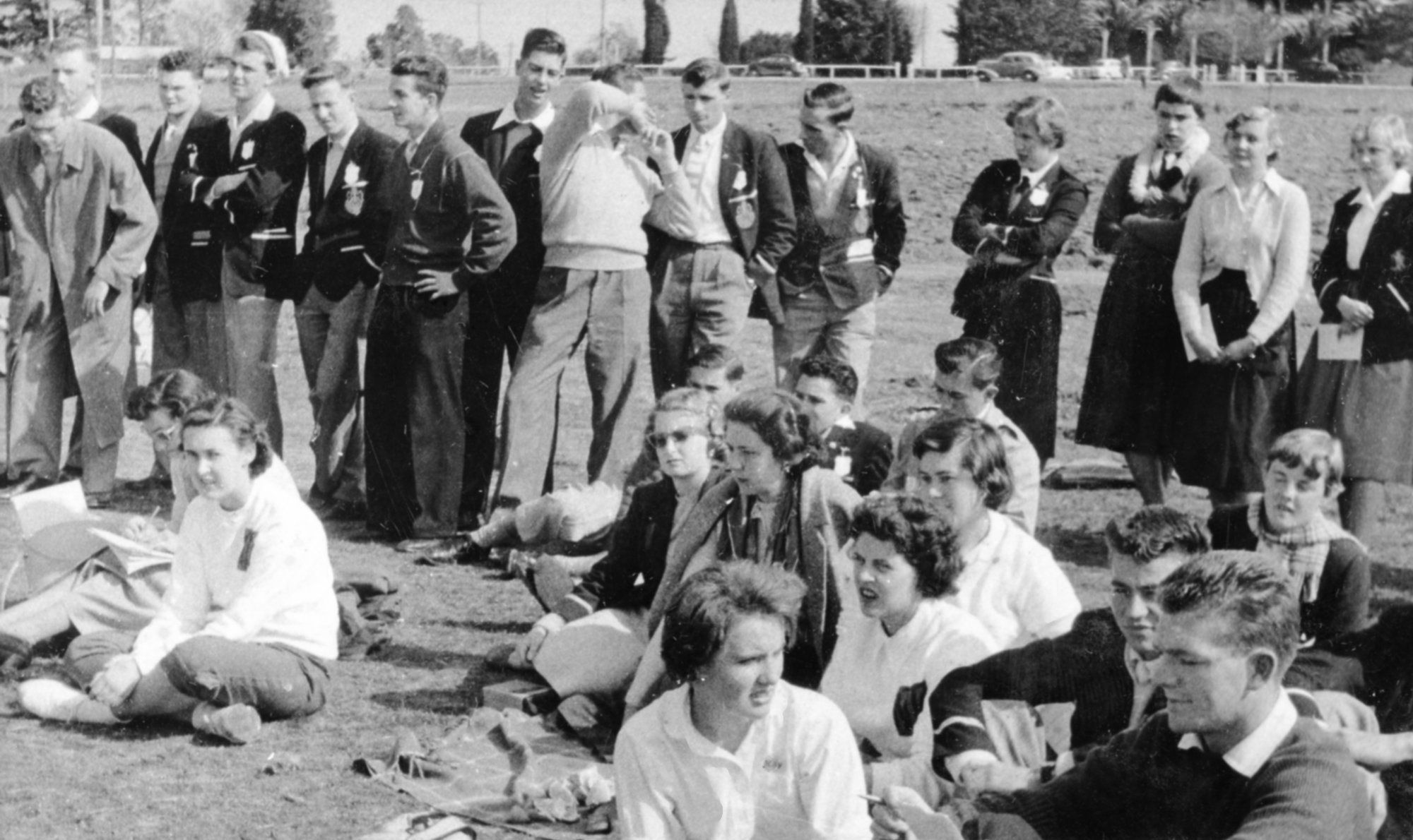 Spectators at a Rugby Union match. A photograph from the Newcastle Teachers' College, NSW, Australia 1957 Album