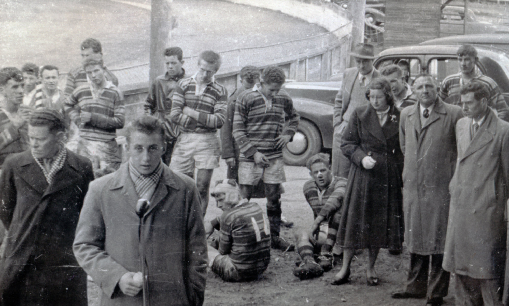 A Rugby Union match. A photograph from the Newcastle Teachers' College, NSW, Australia 1957 Album (1957), [B16477-19570025c]. Living Histories, accessed 18/02/2026, https://livinghistories.newcastle.edu.au/nodes/view/20731