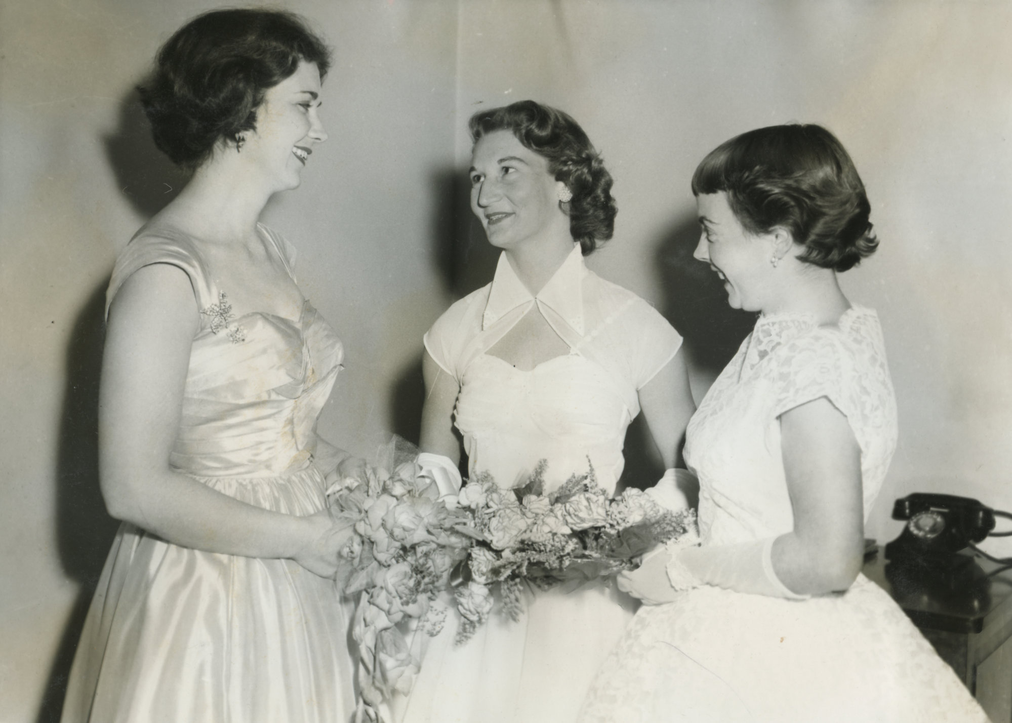 Three unidentified debutantes from Newcastle Teachers' College at the debutante ball, NSW, Australia - 1957 (1957), [B16477-19570010]. Living Histories, accessed 14/02/2026, https://livinghistories.newcastle.edu.au/nodes/view/20768