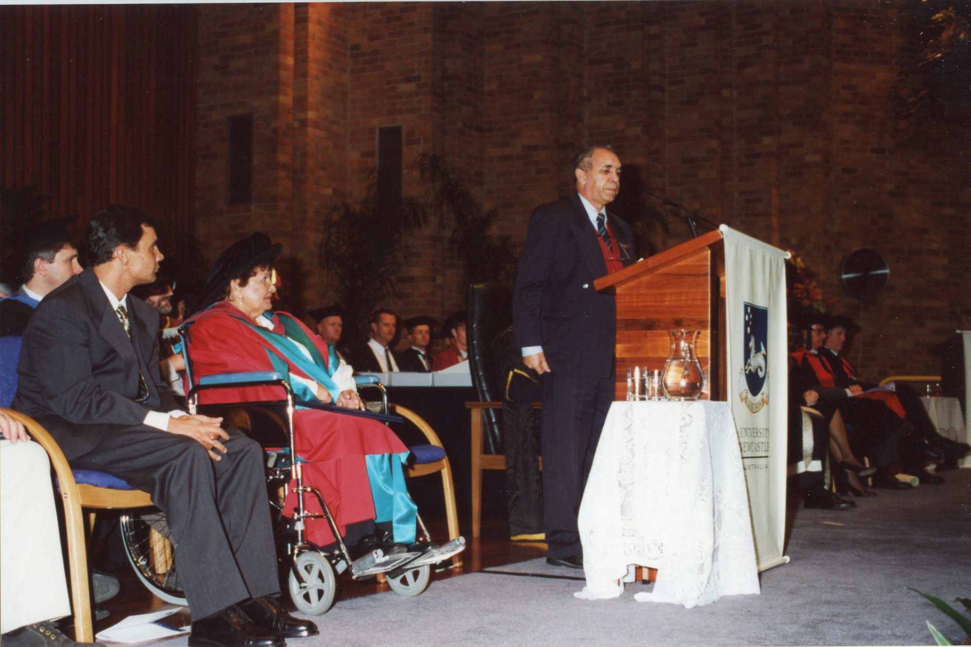 An Aboriginal man addresses the graduation ceremony audience, the University of Newcastle, Australia - May, 2000 (2000), [B16452-0009219]. Living Histories, accessed 15/04/2026, https://livinghistories.newcastle.edu.au/nodes/view/21753