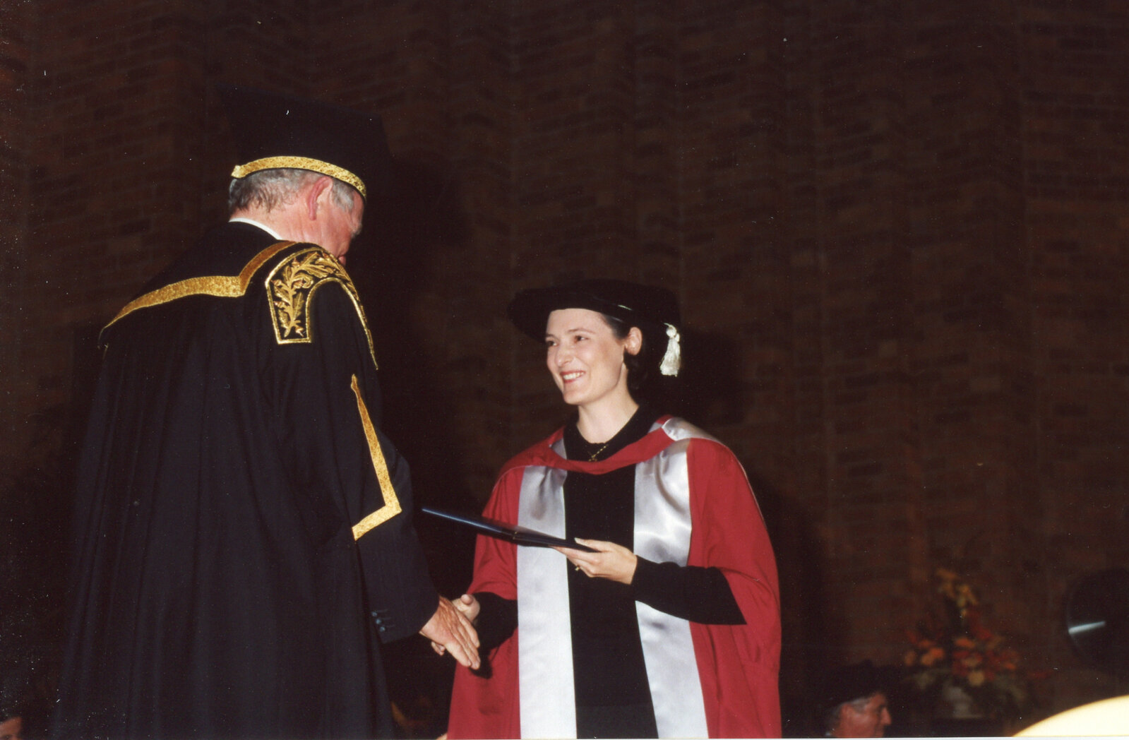 Chancellor Ric Charlton presents a PhD recipient with her award, the University of Newcastle, Australia - May, 2000