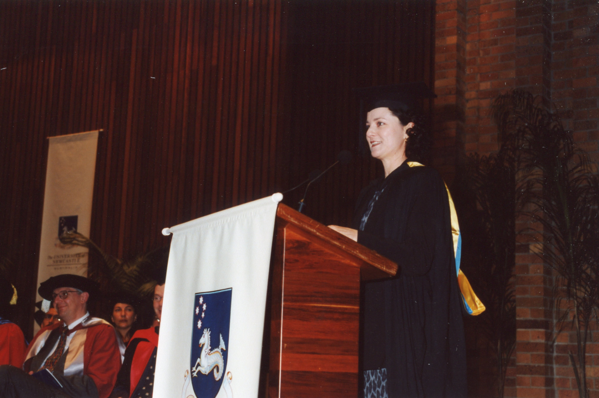 An unidentified graduate addresses the graduation ceremony audience, the University of Newcastle, Australia - May, 2000