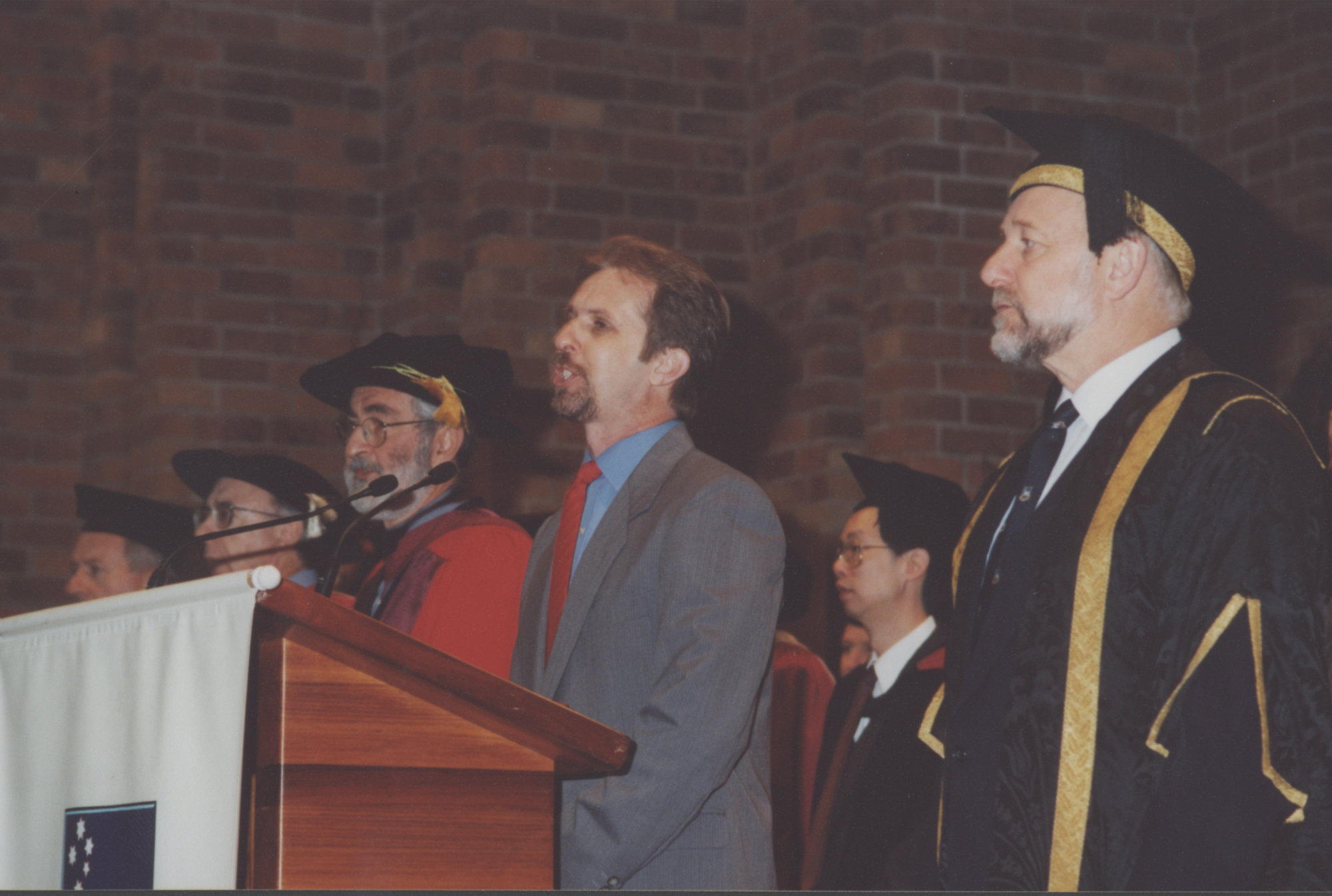 Mr Glen Avery delivers a speech while Deputy Chancellor Trevor Waring and Brian Suters look on, the University of Newcastle, Australia - May, 2000