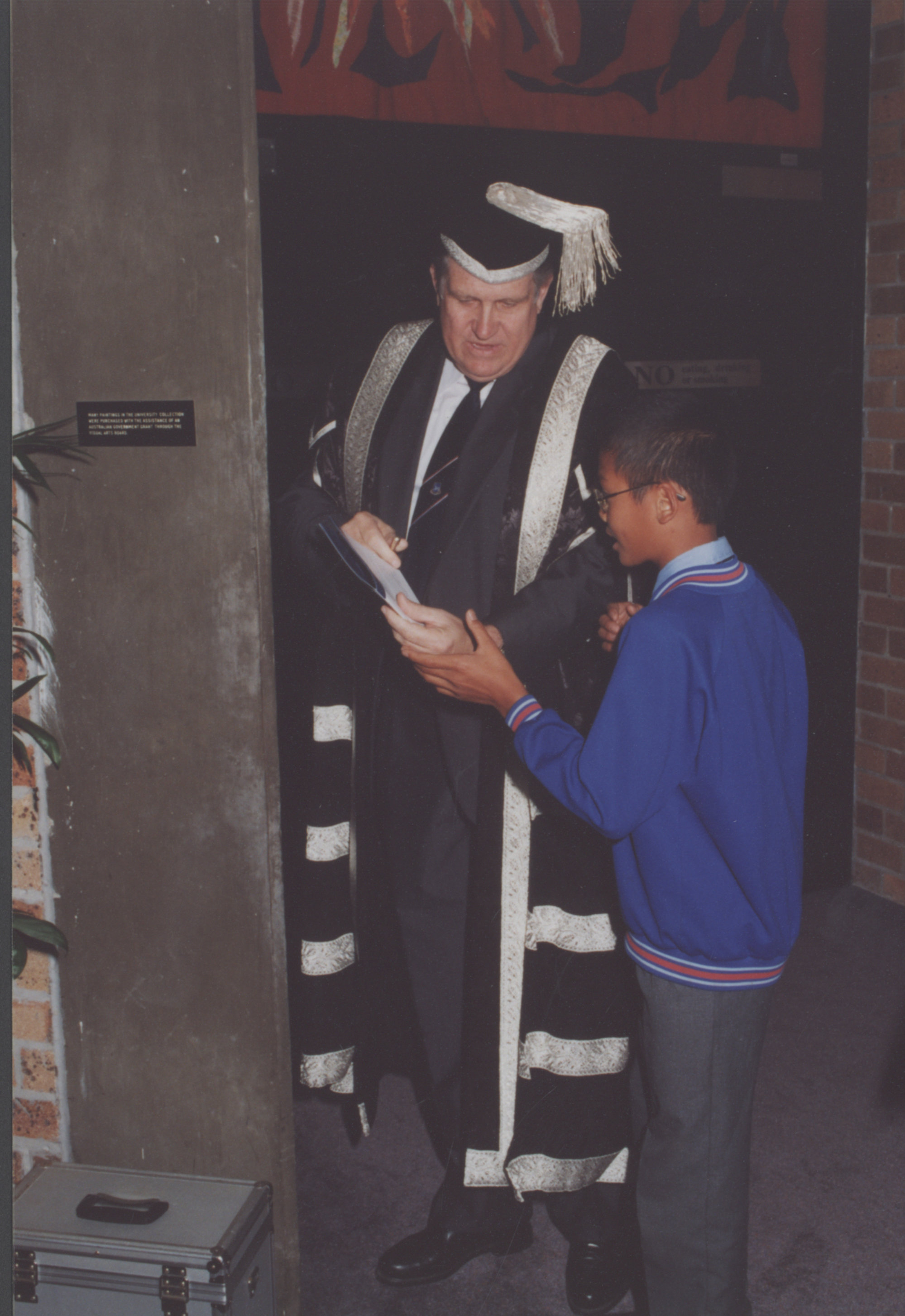 Vice-Chancelllor, Professor Roger Holmes shows a boy the graduation ceremony program, the University of Newcastle, Australia - May, 2000