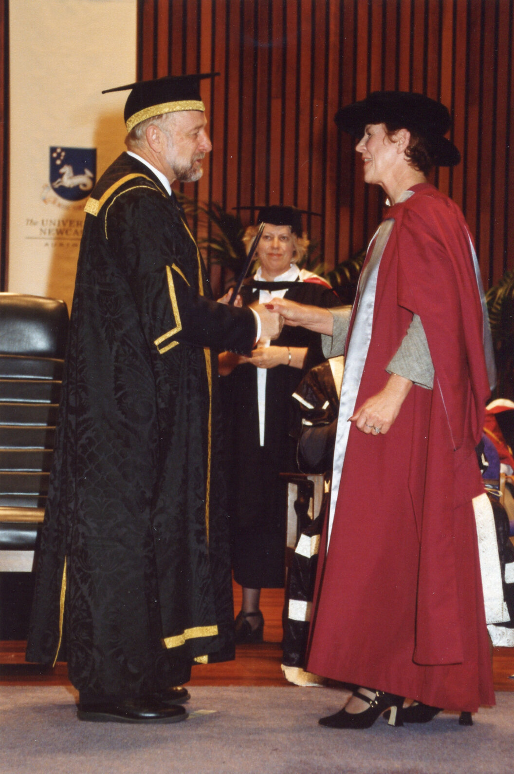 Deputy Chancellor Trevor Waring congratulates a post graduate recipient, the University of Newcastle, Australia - May, 2000