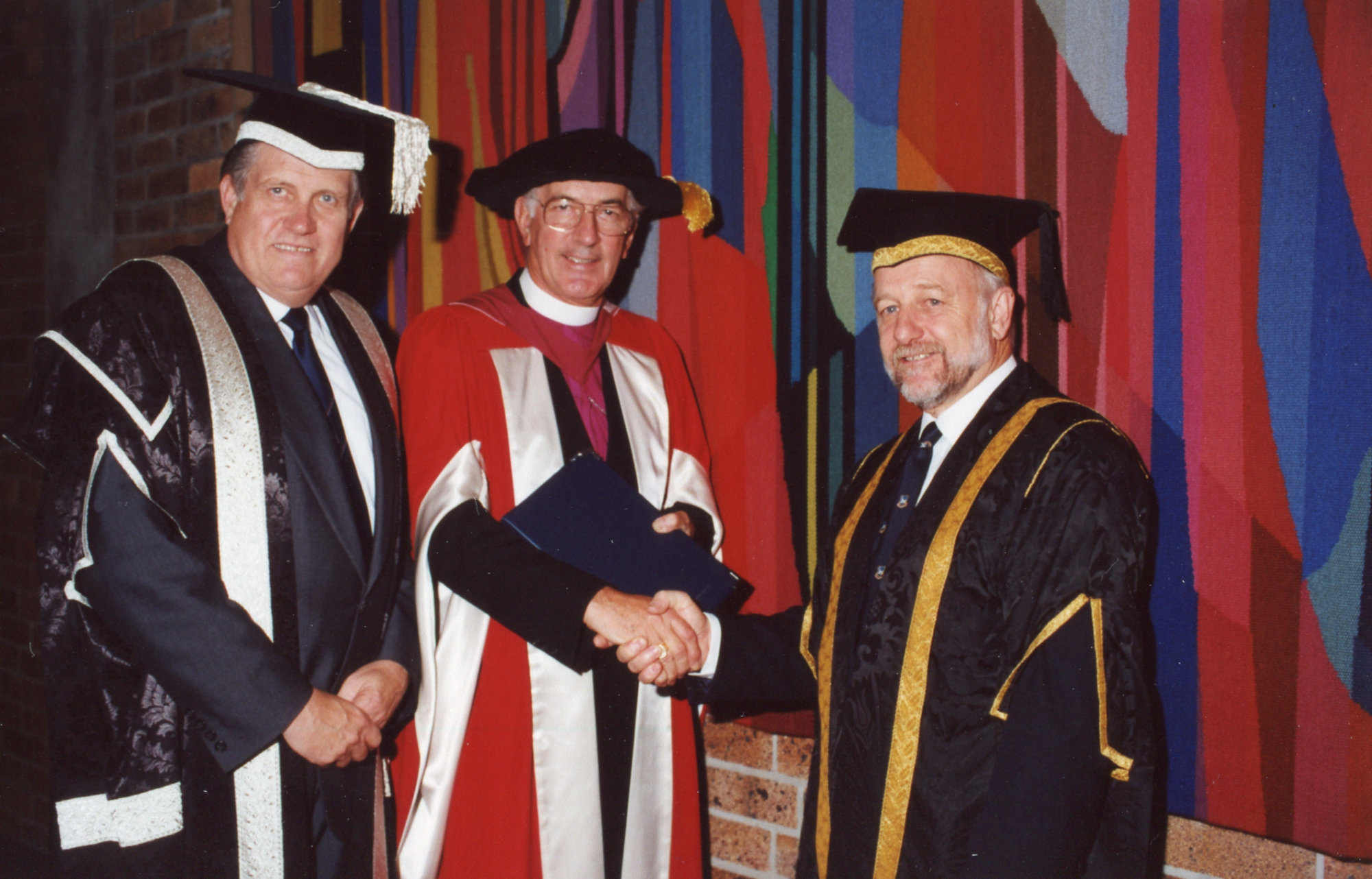 Vice-Chancellor, Professor Roger Holmes with an unidentified man and Deputy Chancellor Trevor Waring, the University of Newcastle, Australia - May, 2000