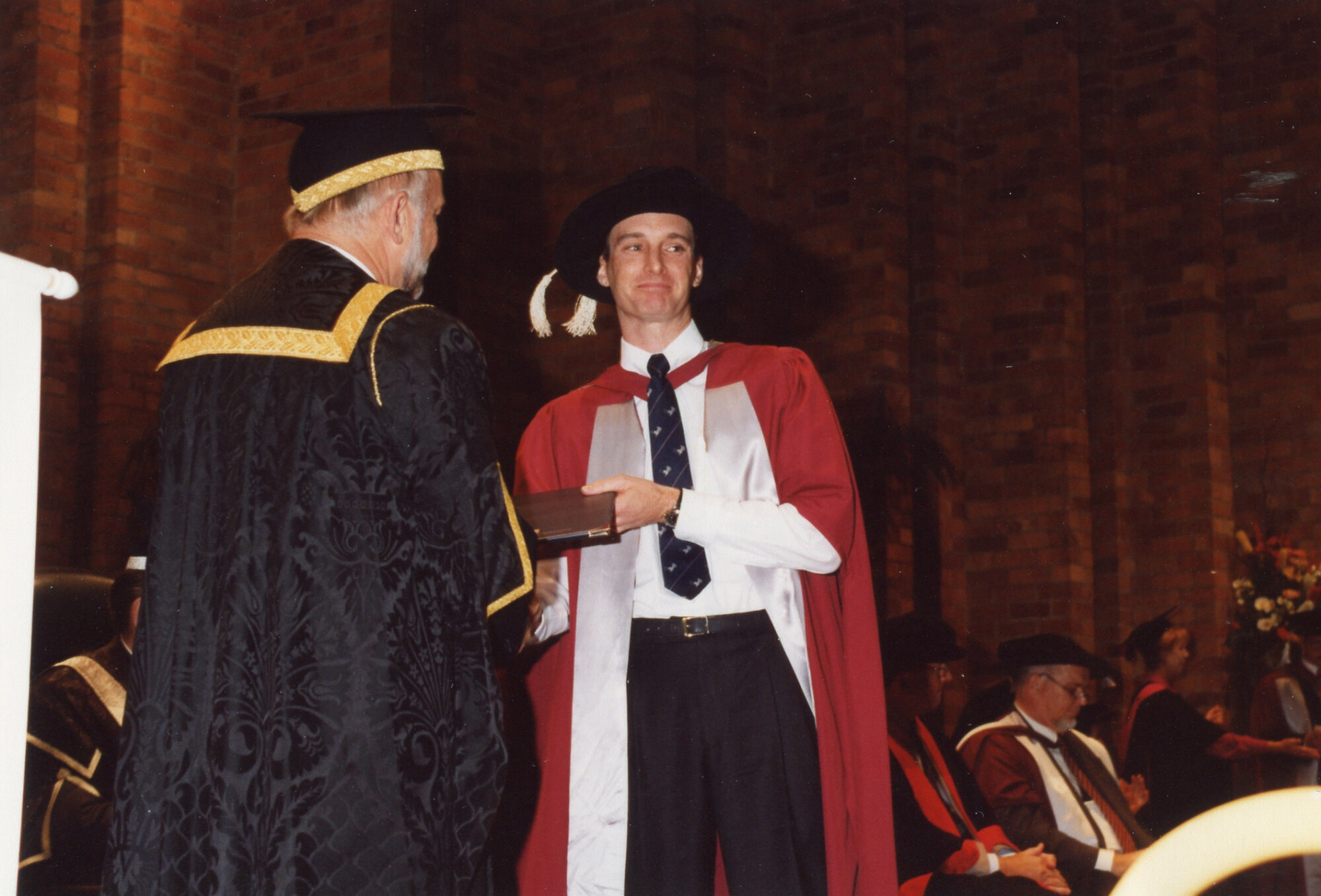Deputy Chancellor Trevor Waring congratulates a PhD recipent, the University of Newcastle, Australia - May, 2000