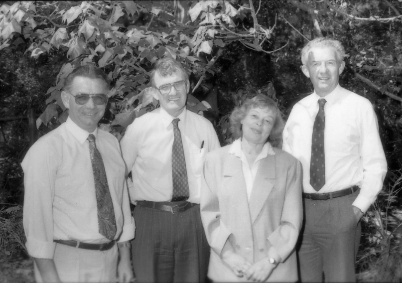 Professor Ron MacDonald (far left) and Professor John Hamilton (far right) with two unidentified people, the University of Newcastle, Australia - 1991