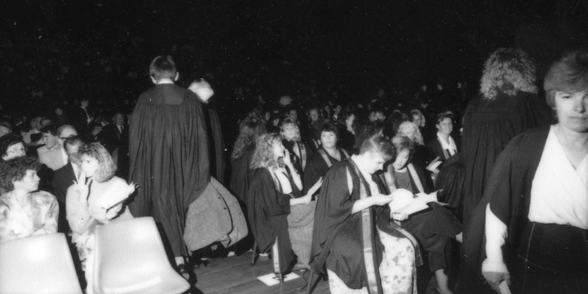 Graduates return to their seats after receiving their Degrees at the graduation ceremony, the University of Newcastle, Australia - 1991 (1991), [P3018-49b]. Living Histories, accessed 07/03/2026, https://livinghistories.newcastle.edu.au/nodes/view/22741