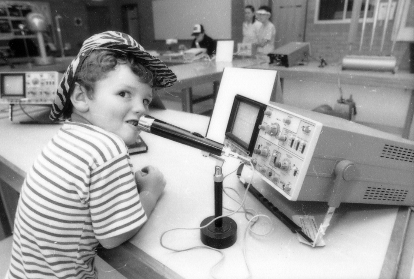 University Open Day 1991 - a young child inspects [Engineering] equipment, the University of Newcastle, Australia - 1991