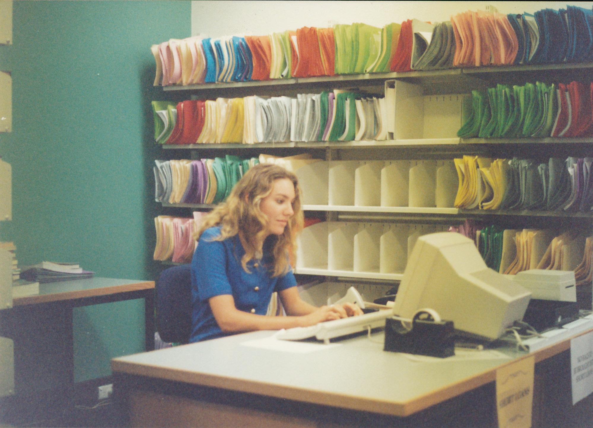 Unidentified library staff member [work experience girl] at the short loans service point [1995].