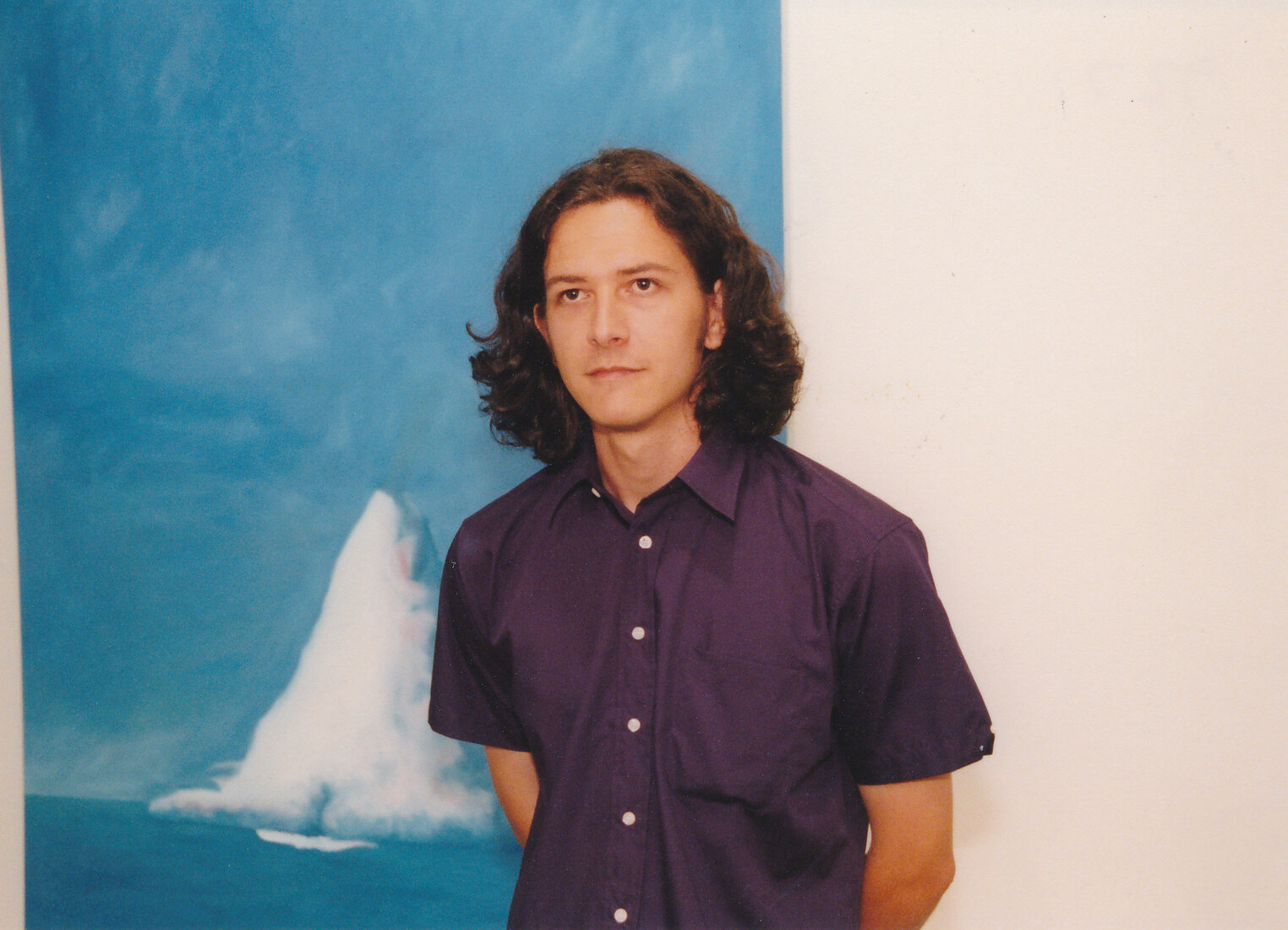 Unidentified person with his work at a Central Coast Campus art exhibition.