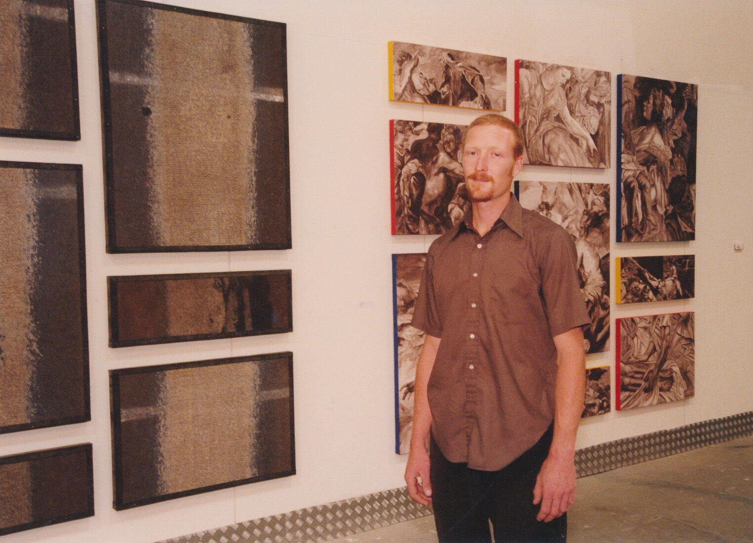 Unidentified person with his work at a Central Coast Campus art exhibition.