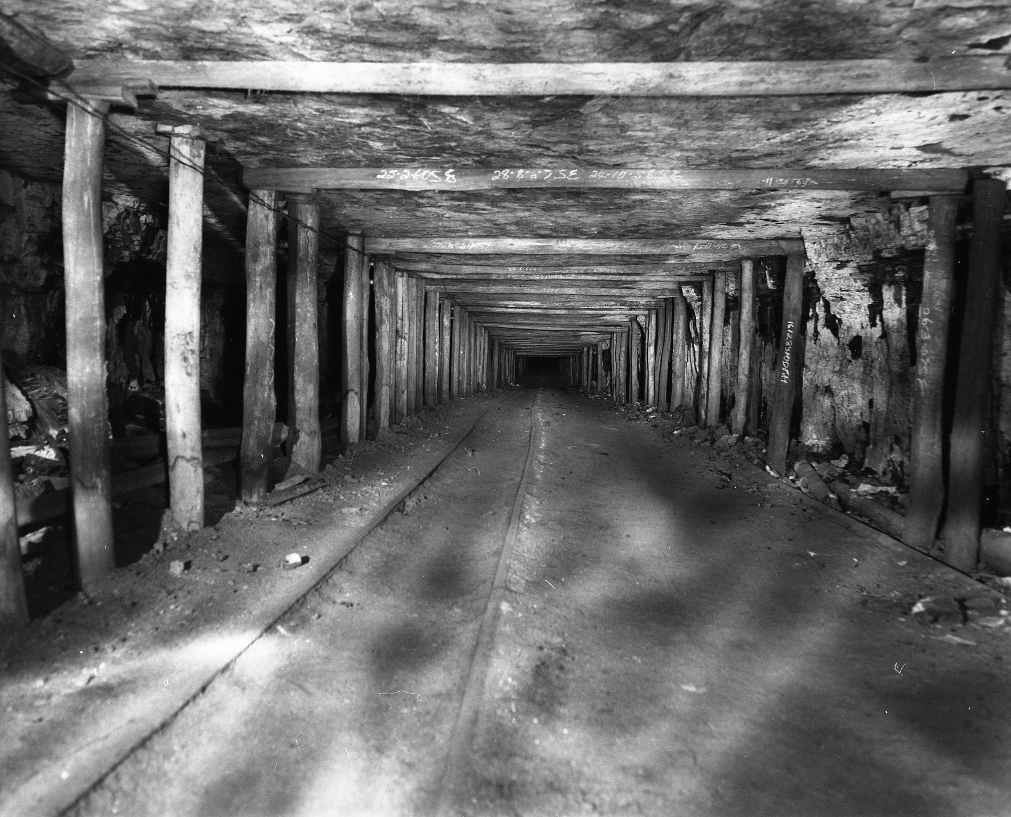 Wooden skips underground in old workings, Stockrington No. 2 Colliery, NSW, June 1988