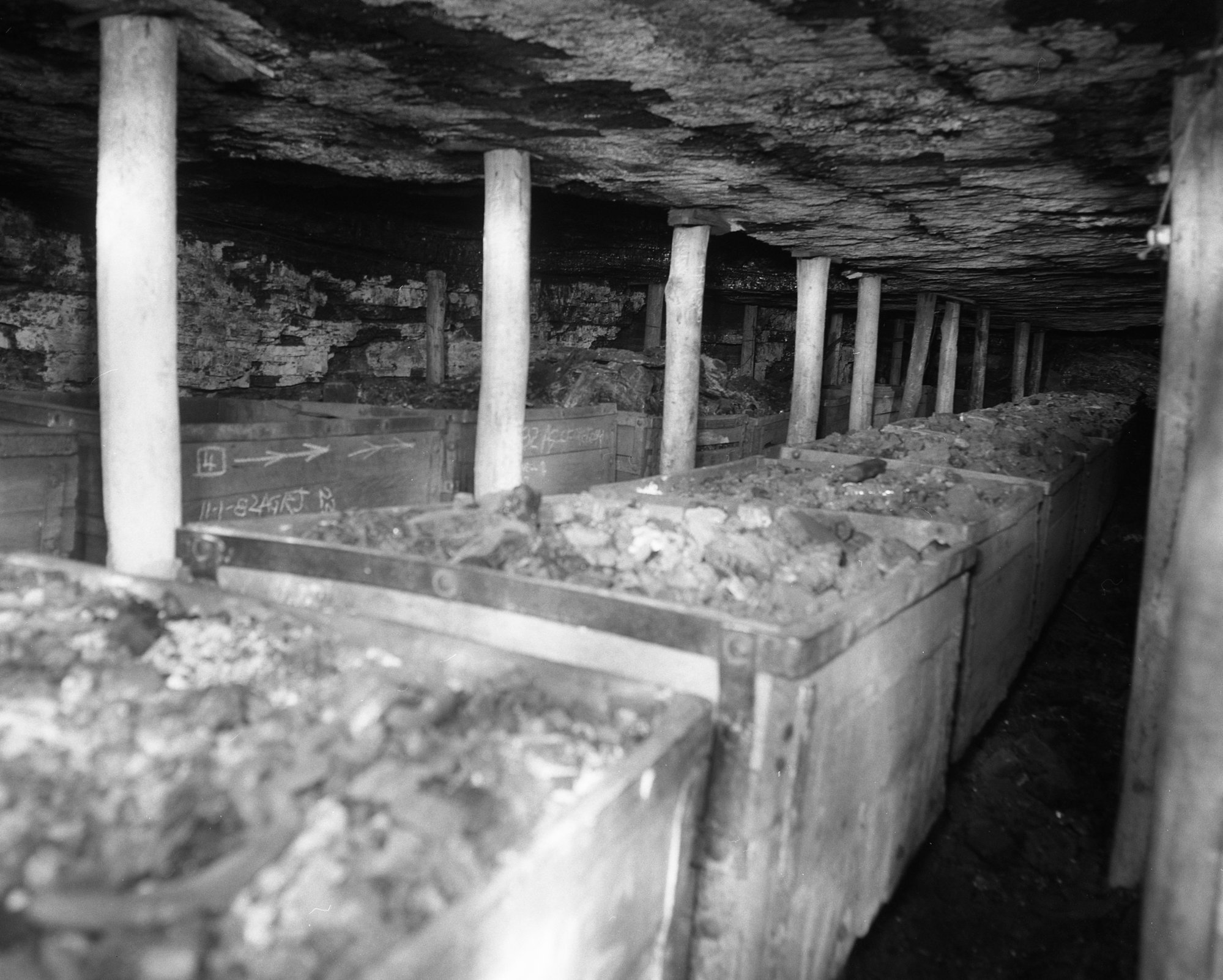 Wooden skips underground in old workings, Stockrington No. 2 Colliery, June 1988