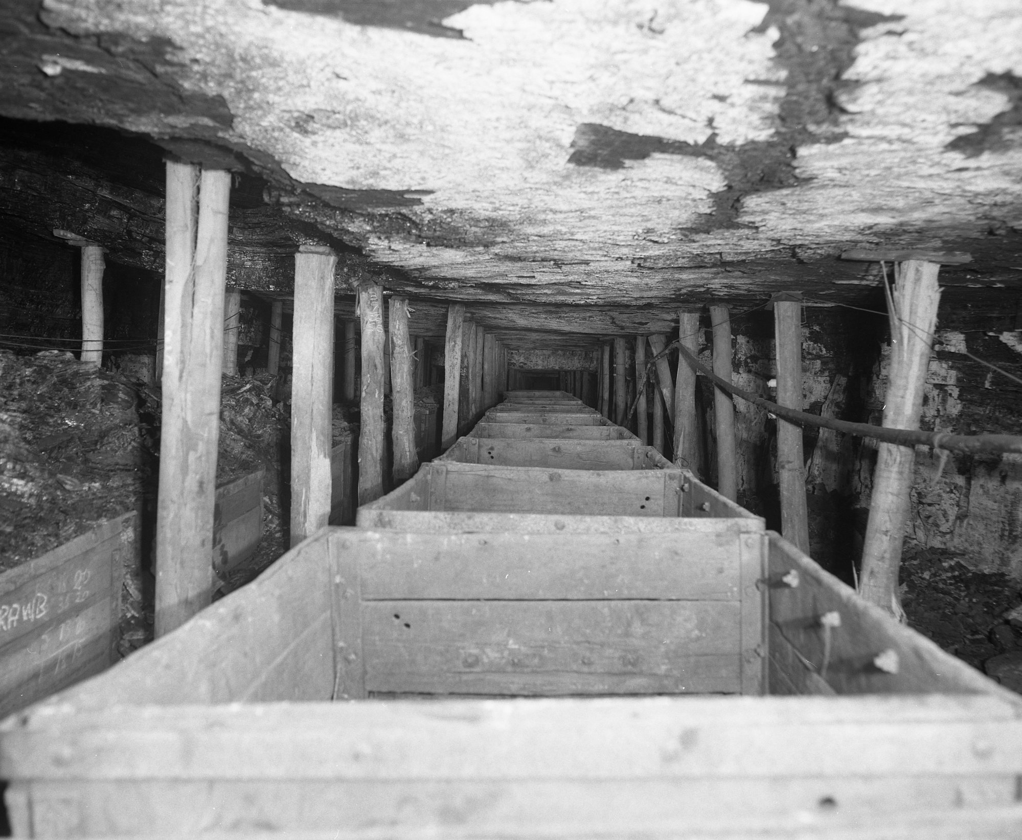 Wooden skips underground in old workings, Stockrington No. 2 Colliery, June 1988