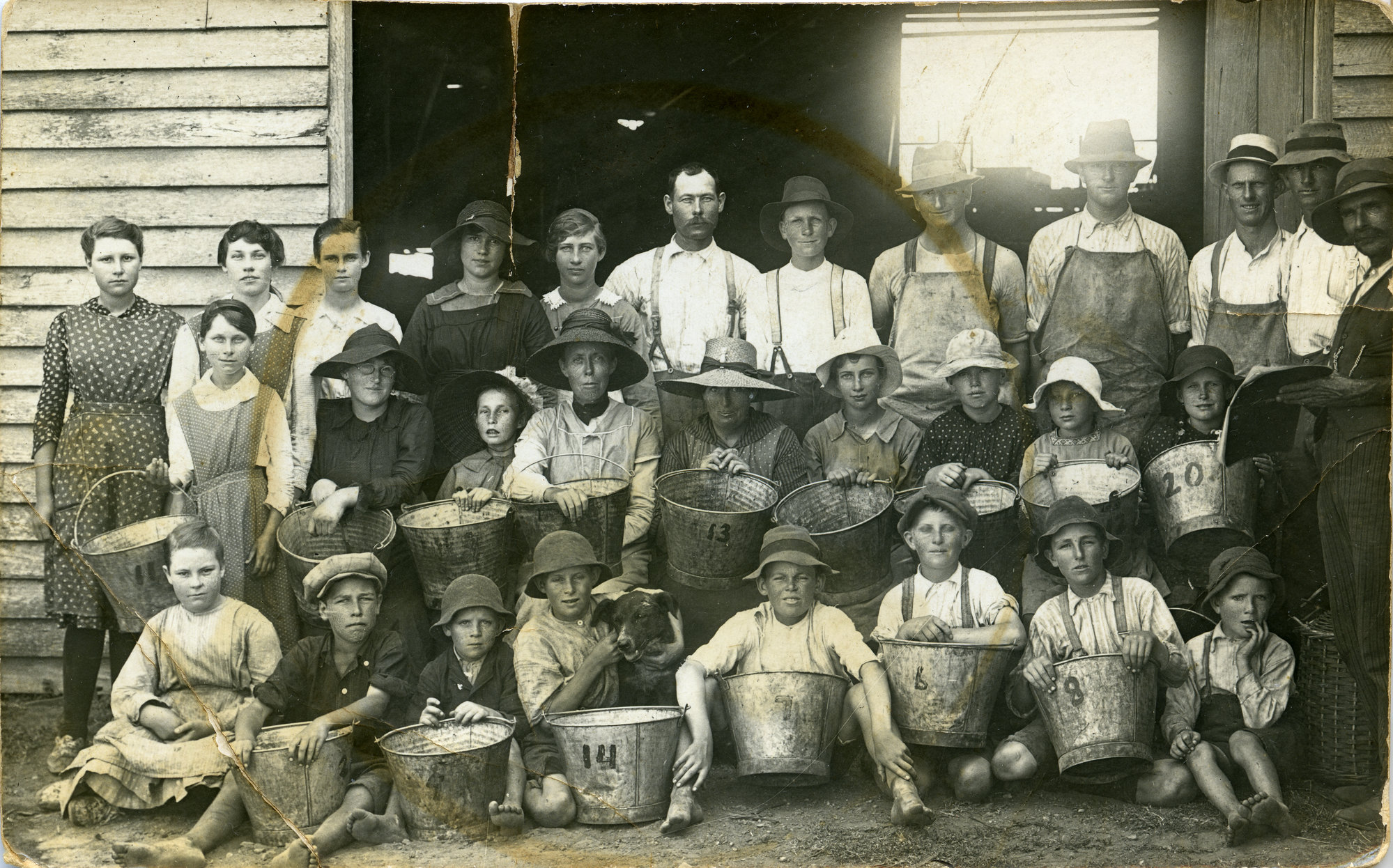 Grape pickers at Keinbah, NSW, [n.d.]. Back row, second from right is Bill Barnard. Ethel Hawkins is seated, second from the left, in the dark dress and hat.