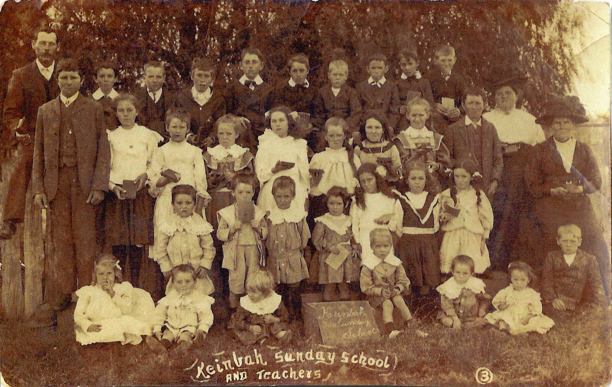 Keinbah Sunday School and teachers, Keinbah, NSW, [n.d.. End of middle row - white blouse, Grandma Mears, nee Clara Barnard. End of next row with hat - Great Grandma Barnard, Emma Barnard, nee Nichols.]