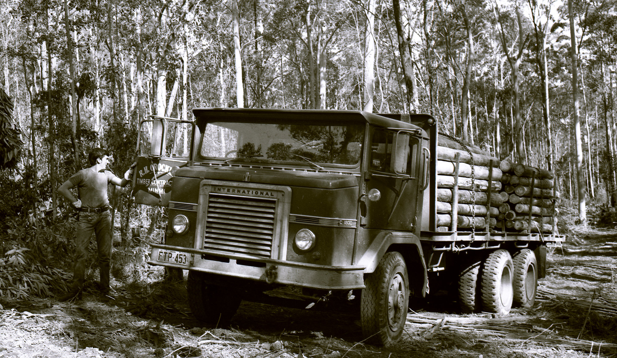 Lockett, Phillip, Neal Lockett beside R.H. Crockett's timber truck with a load of pit props, Blue Gum Creek, Stockrington, 17 June 1977, [OL_Lockett_090]. Living Histories, accessed 09/03/2026, https://livinghistories.newcastle.edu.au/nodes/view/27007