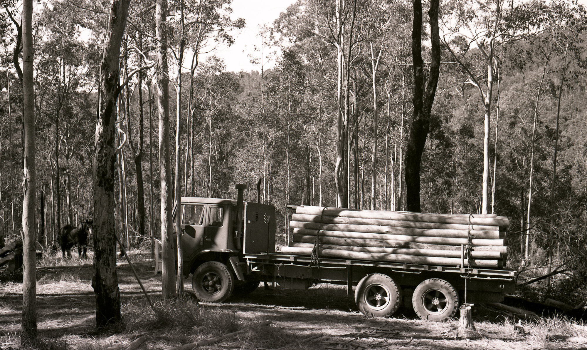 A truck load of stringers for Stockrington Colliery. Lockett's snigging horse "Joker" at left. The truck belonged to R.H. Crockett, Timber Contractor, Minmi. Stockrington, NSW, 1980.