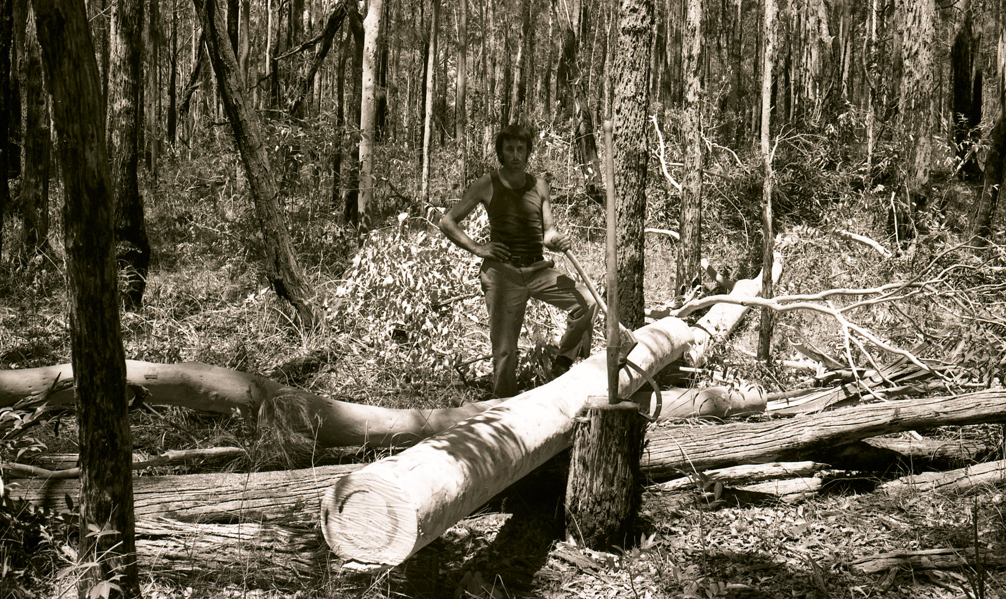 Phillip Lockett taking the bark off with an axe, Leggett's West Wallsend region, NSW, 1979.