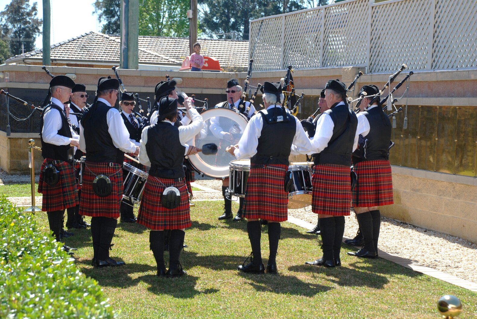Pipe band at the memorial service at the Jim Comerford Miners Memorial Wall, Aberdare, NSW, 22 September 2013