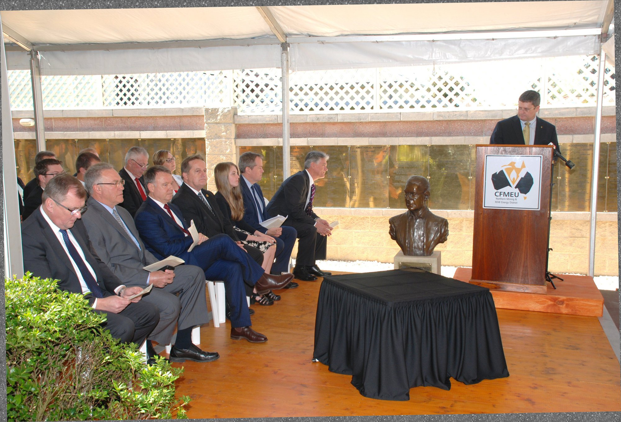 Speaker and audience at the Memorial Service at the Jim Comerford Miners Memorial Wall, Aberdare, NSW, 2014