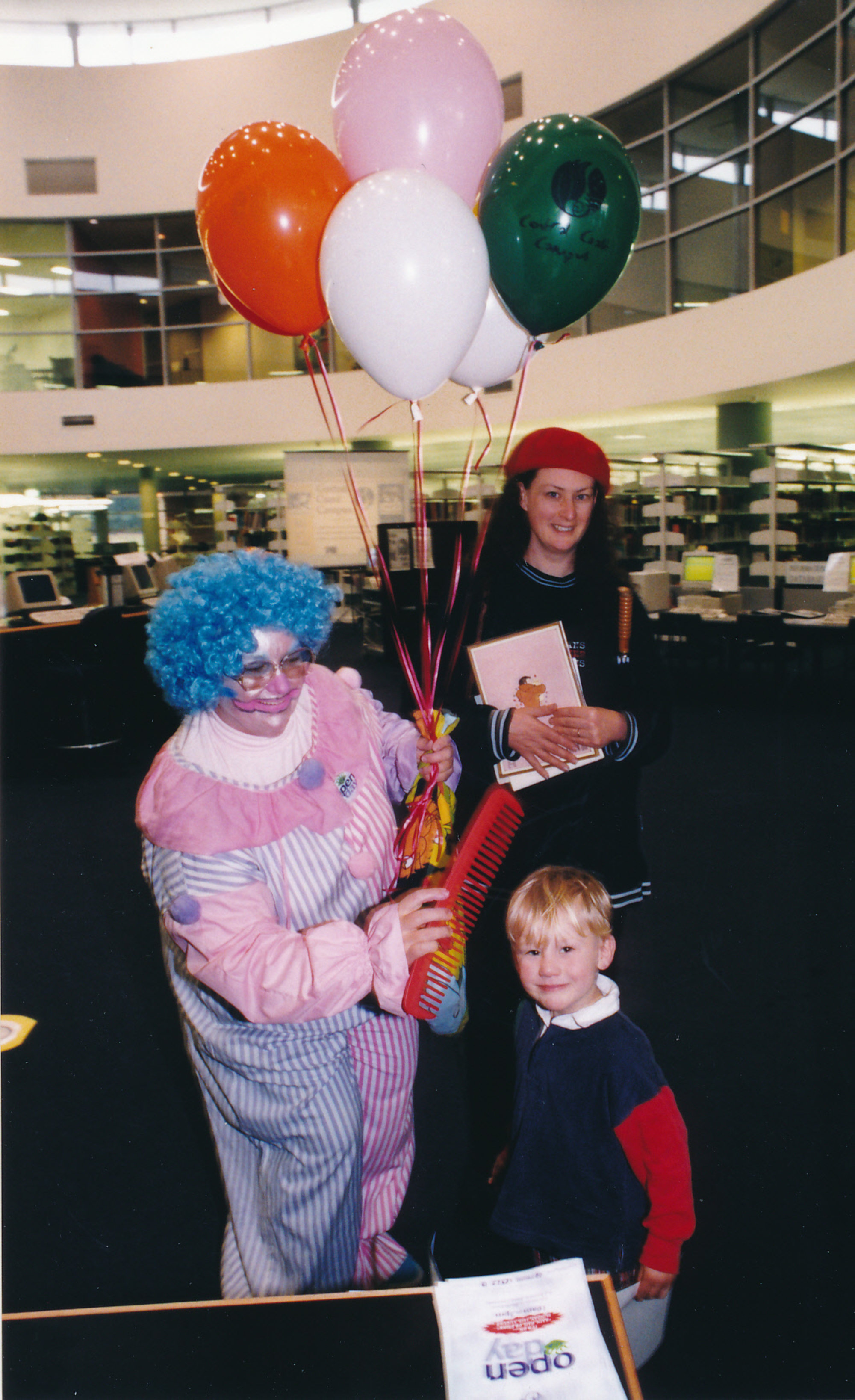 Unidentified children with an unidentified clown in the Central Coast Campus Library during an open day [n.d.] [Some of the same people as previous image 01589], [B004_IMG1590]. Living Histories, accessed 24/01/2026, https://livinghistories.newcastle.edu.au/nodes/view/29484