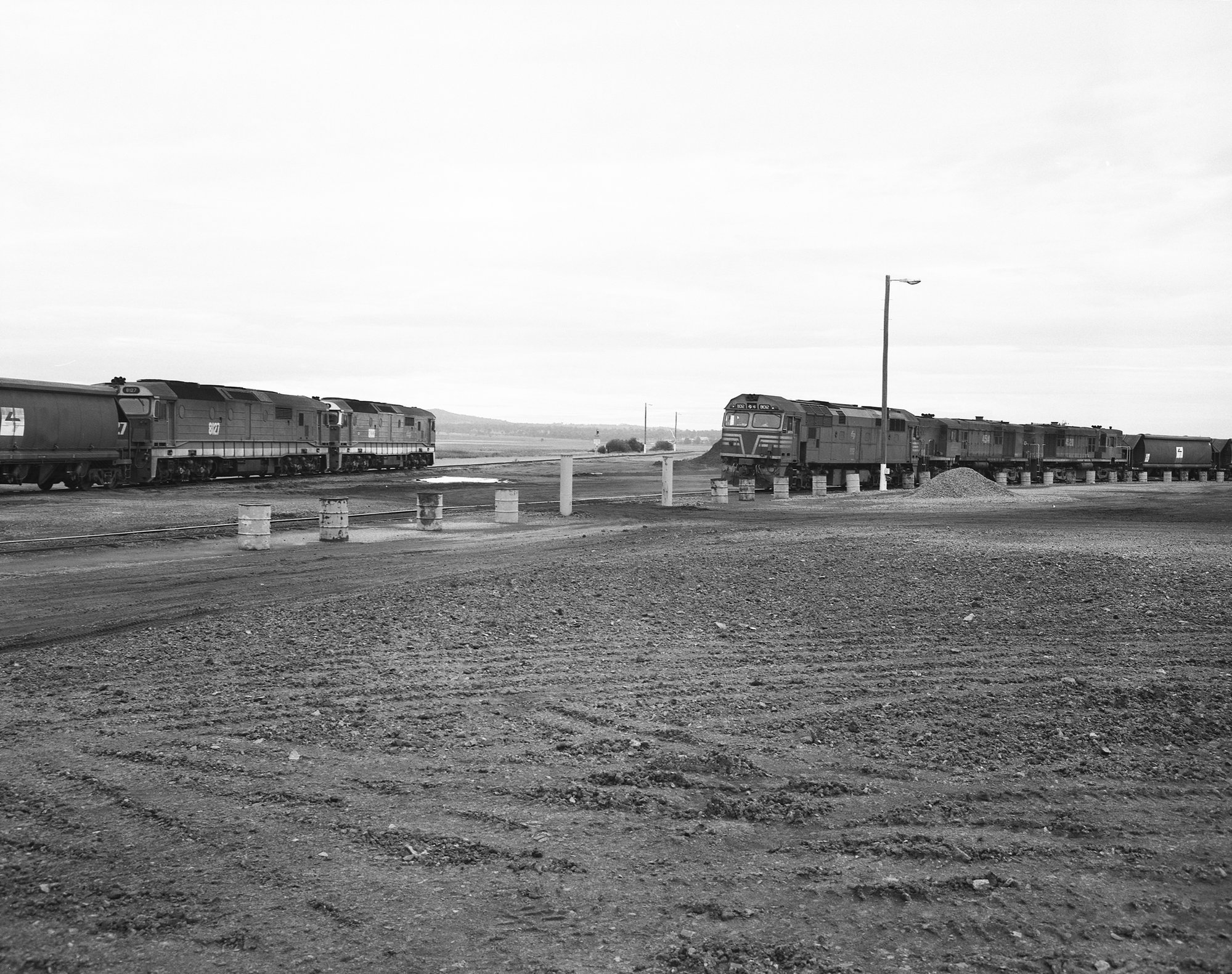 Andrews, Brian R., Trains on Hexham Balloon Loop. 8012 + 4514 + 4530 crossing 8133 +8127, 23 May 1988. These were the last two trains to cross on Loop., [BRAN489_007]. Living Histories, accessed 16/02/2026, https://livinghistories.newcastle.edu.au/nodes/view/29910