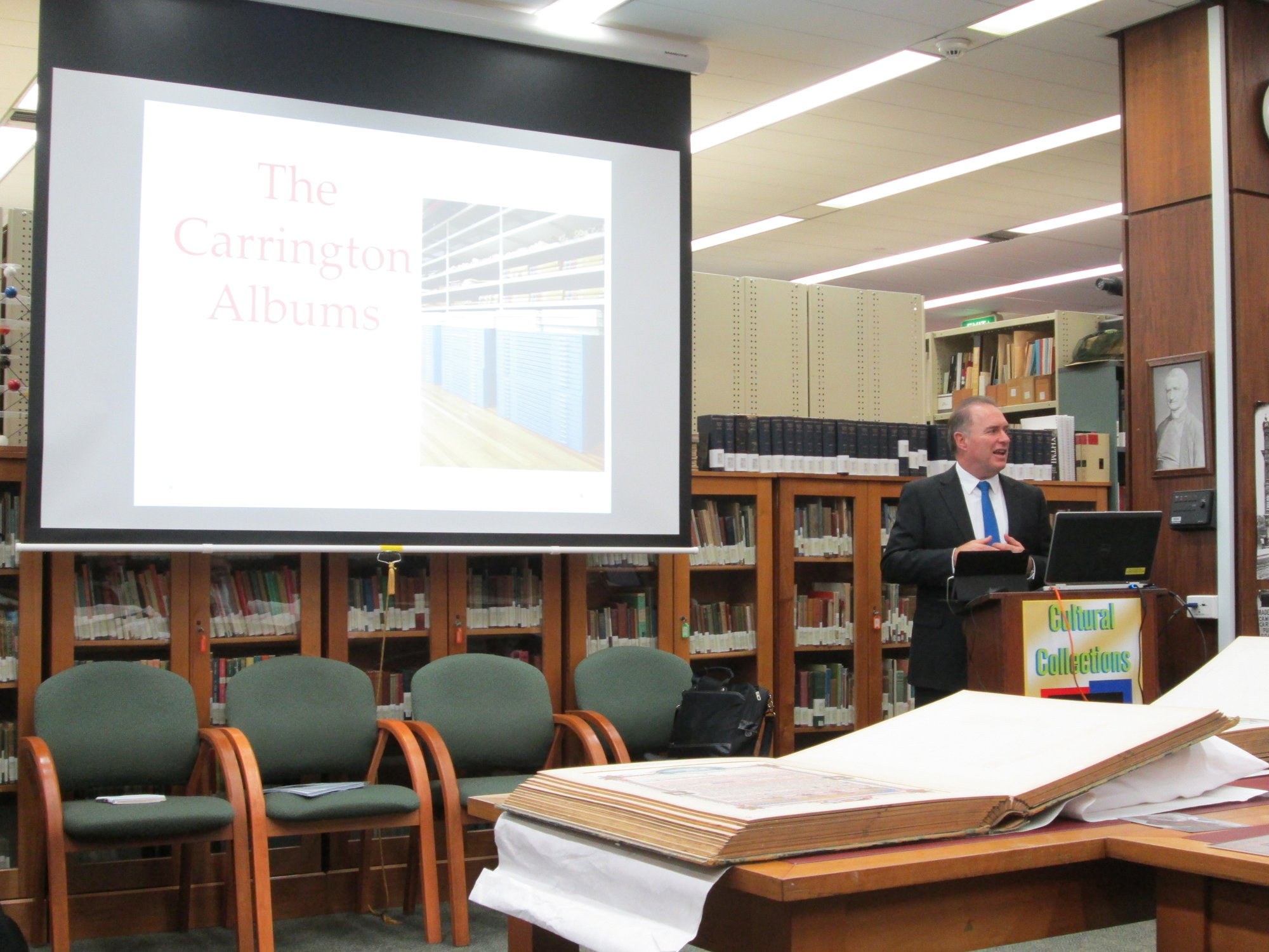 Geoff Hinchcliffe, Director, of State Records NSW, with Carrington Albums, University of Newcastle, 3 June 2015
