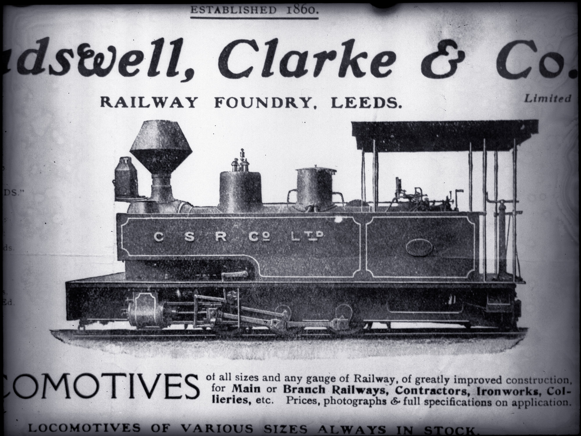 Advertisement for Hudswell Clarke & Company Ltd, showing C.S.R. tank locomotive [c.1920s] ([1920s]), [ARHSBox042_1291]. Living Histories, accessed 17/04/2026, https://livinghistories.newcastle.edu.au/nodes/view/30801