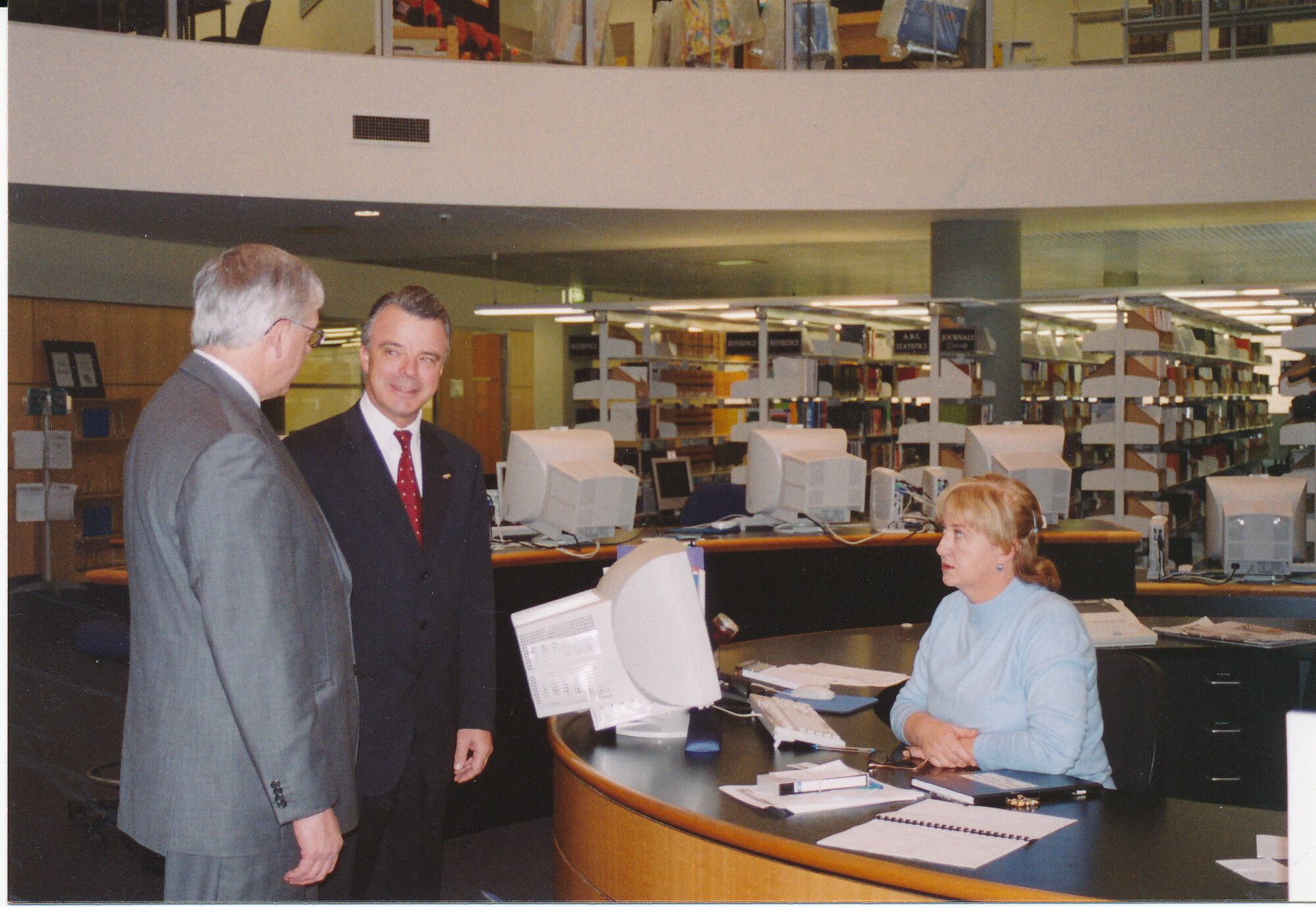 Brendan Nelson with unidentified man talking to librarian, Fiona Neville, in the library, [B001_IMG0204]. Living Histories, accessed 08/03/2026, https://livinghistories.newcastle.edu.au/nodes/view/31162