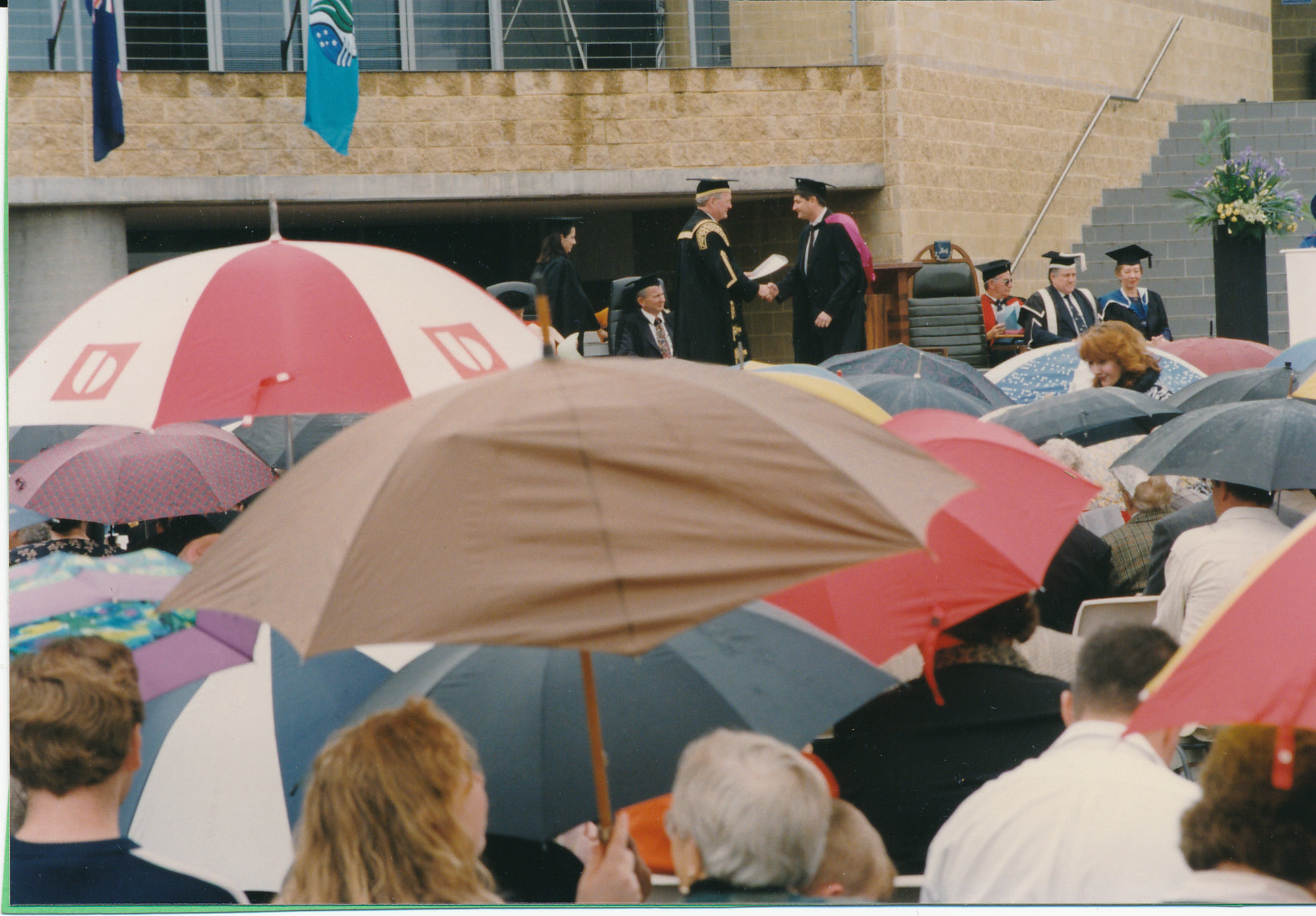 1998 - "The rain failed to dampen spirits". Graduation Ceremony outside the library,