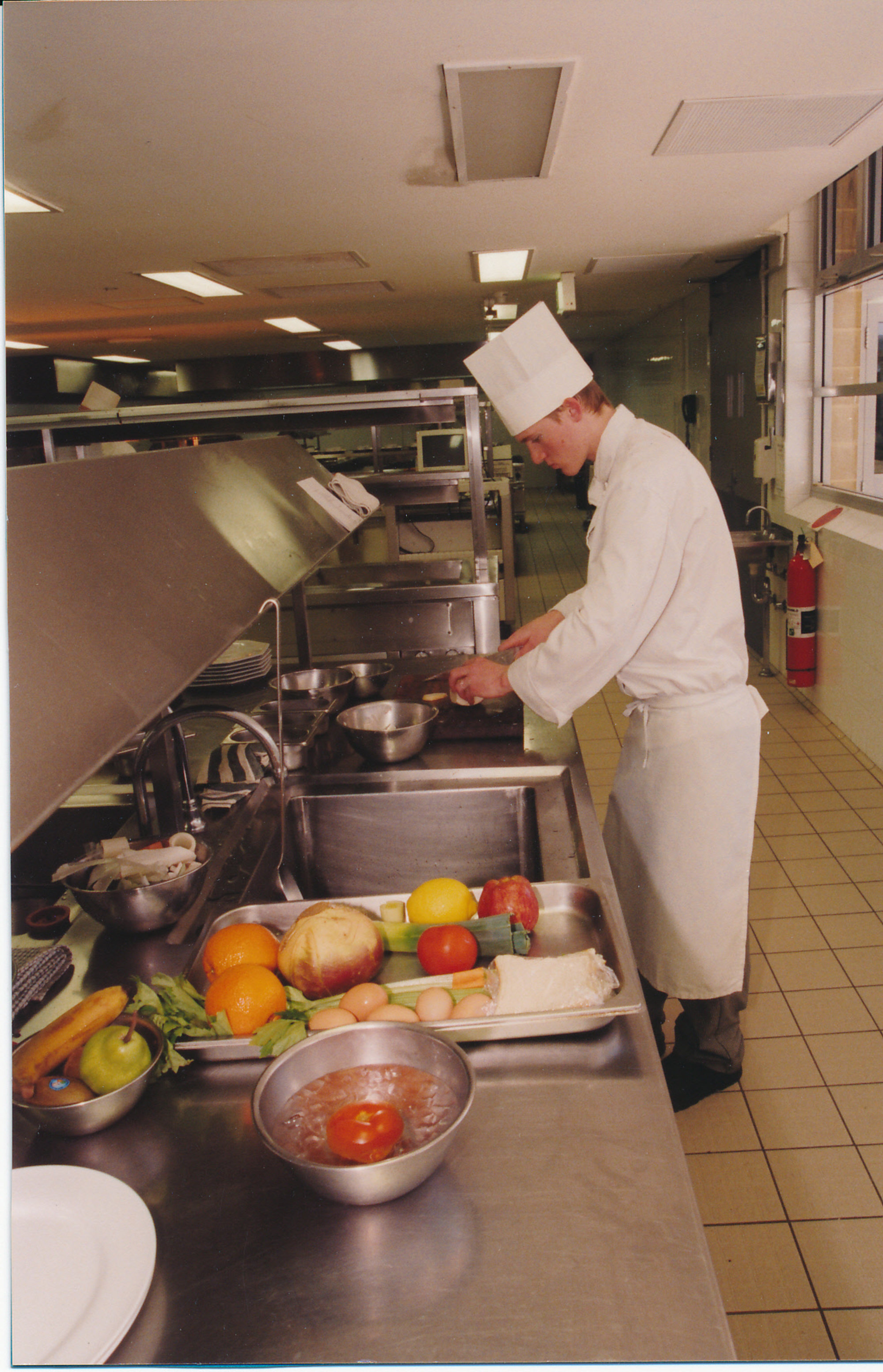 TAFE student during food preparation in kitchens at Tourism & Hospitality, [B001_IMG0030]. Living Histories, accessed 12/02/2026, https://livinghistories.newcastle.edu.au/nodes/view/31339