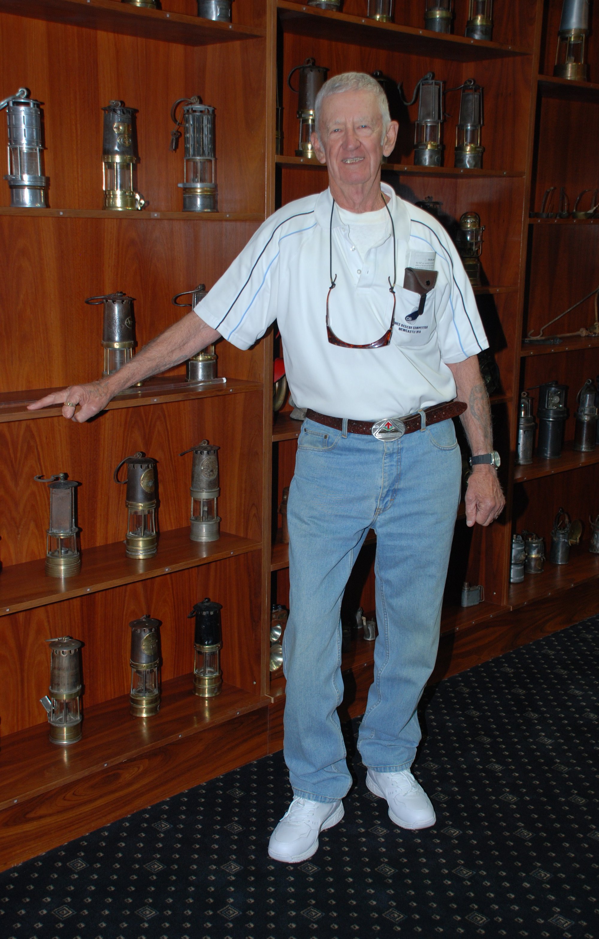 Gentleman explaining the items in display case at the memorial service at the Jim Comerford Miners Memorial Wall, Aberdare, NSW, 9 September 2012