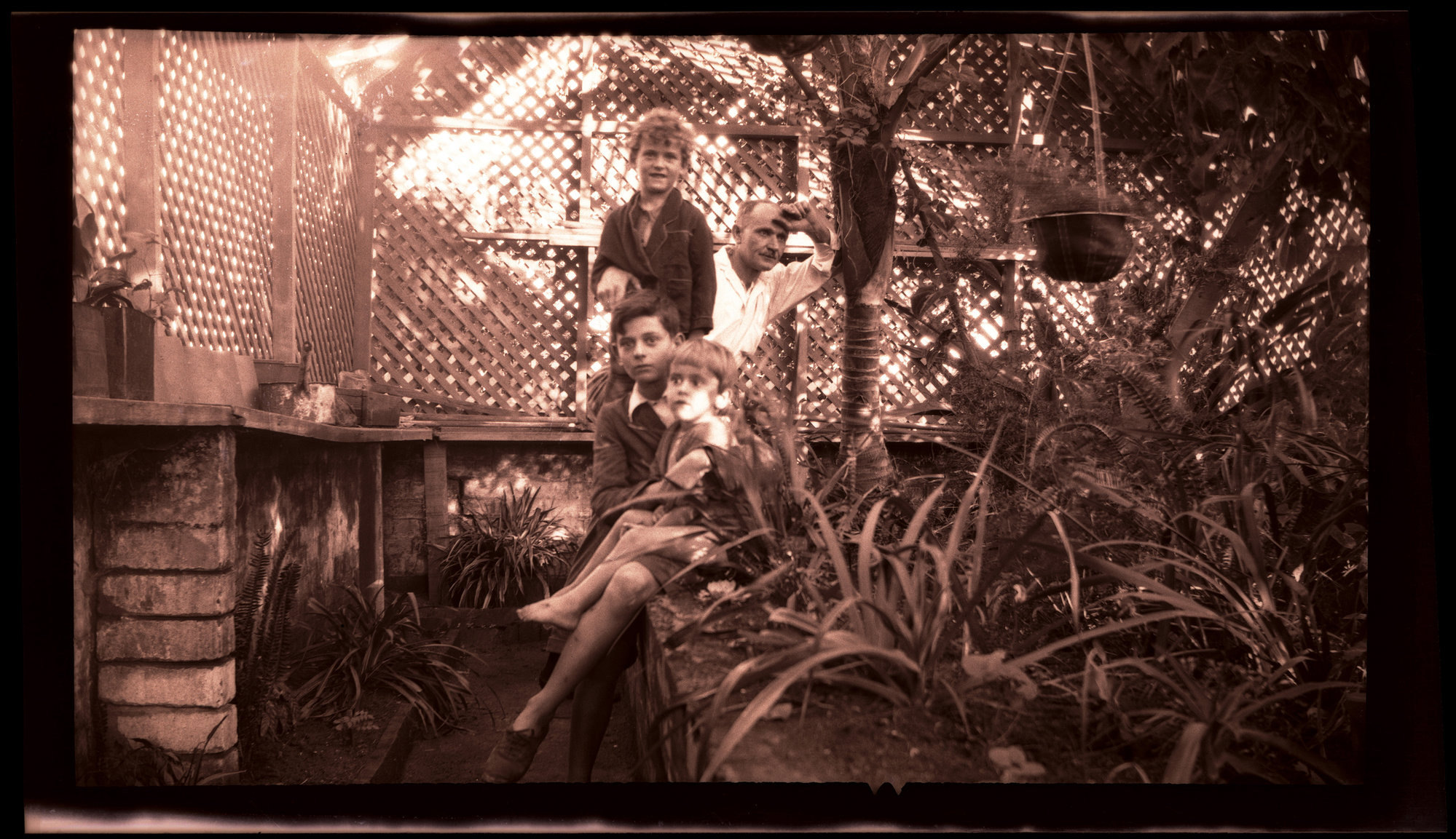 Jim Rodoni, Thomas (T.J.) Rodoni, Thomas Rodoni (Jnr) and Bill Rodoni in greenhouse at residence 'Carclew' Waratah, NSW (film negative), c1920s, [ARODGN_0563]. Living Histories, accessed 15/04/2026, https://livinghistories.newcastle.edu.au/nodes/view/32431