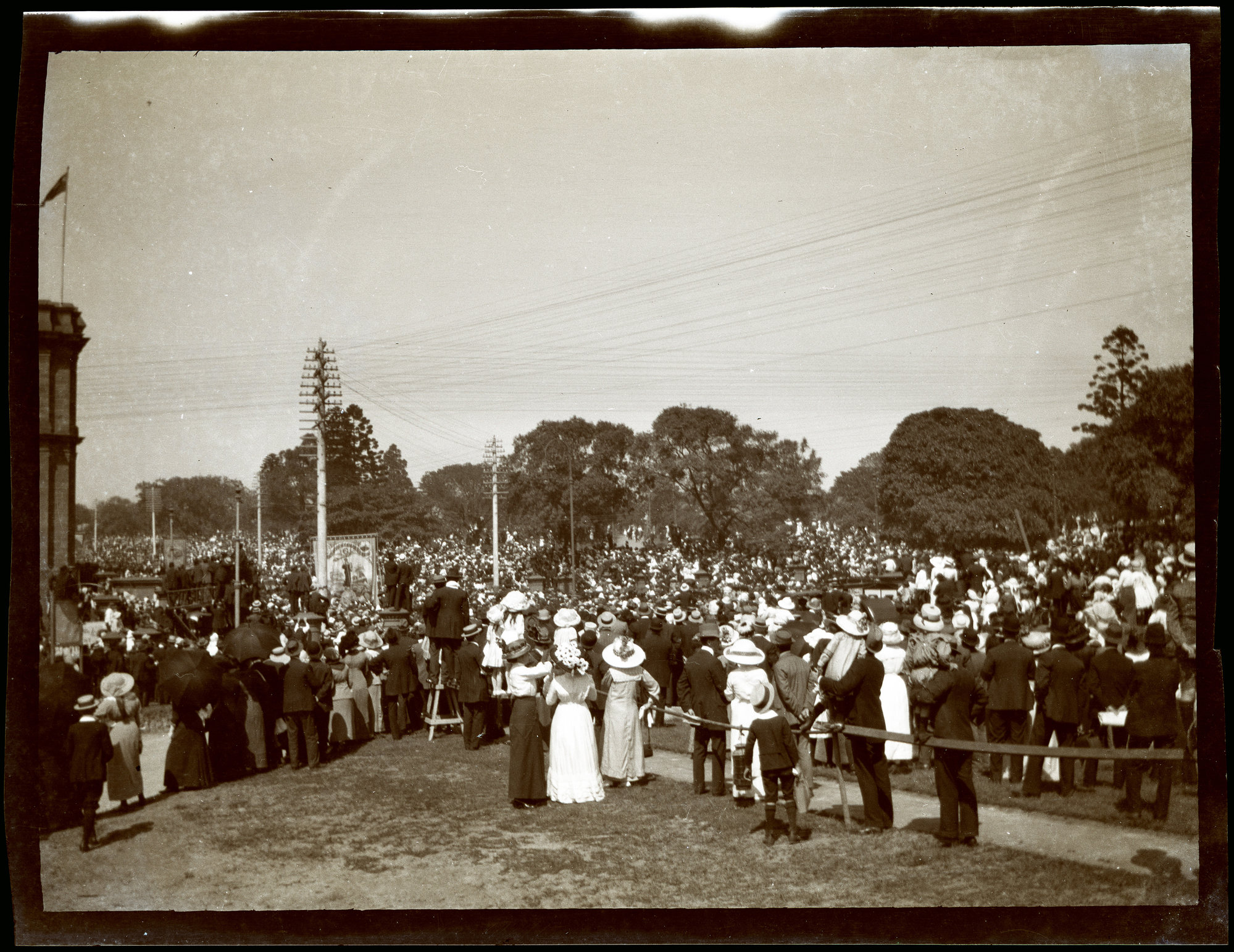 Public gathering at Hyde Park, Australian Museum on left at corner of Park and College Streets, Sydney NSW