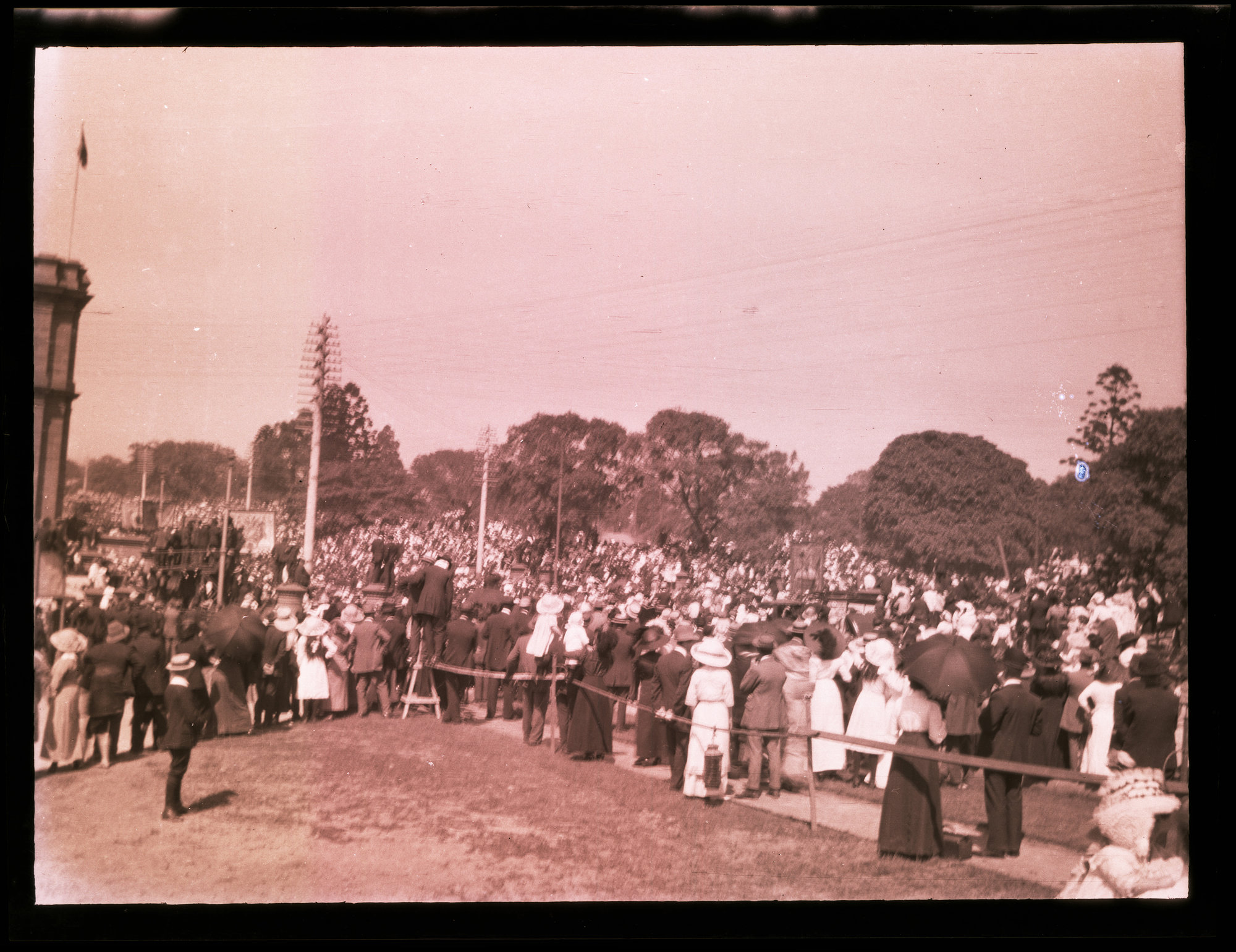 Public gathering at Hyde Park, Australian Museum on left at corner of Park and College Streets, Sydney NSW, c.1914, [ARODGN_0548]. Living Histories, accessed 07/03/2026, https://livinghistories.newcastle.edu.au/nodes/view/32449
