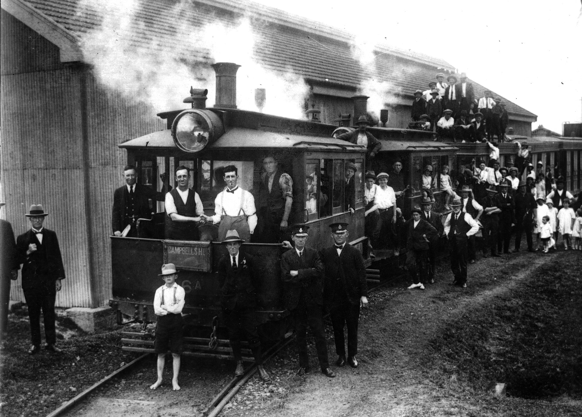 NSWGT, A-Class Steam Tram Motors 6A & 30A with trailers, preparing to depart Maitland for Newcastle, following the Maitland system's closure on 4 January 1927.