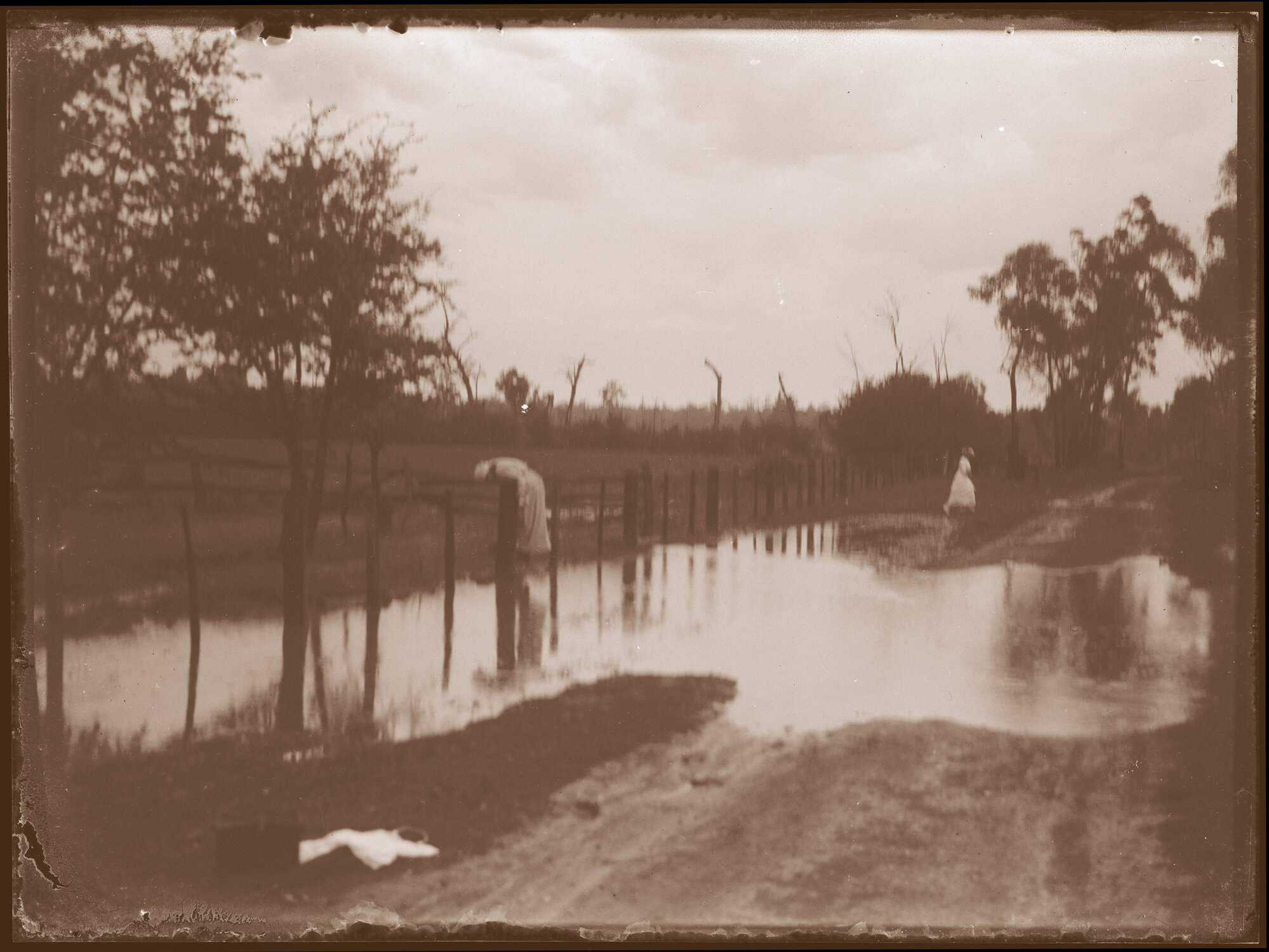 Two girls near a flooded road in a rural district, [ARODGN_0428]. Living Histories, accessed 13/03/2026, https://livinghistories.newcastle.edu.au/nodes/view/32575