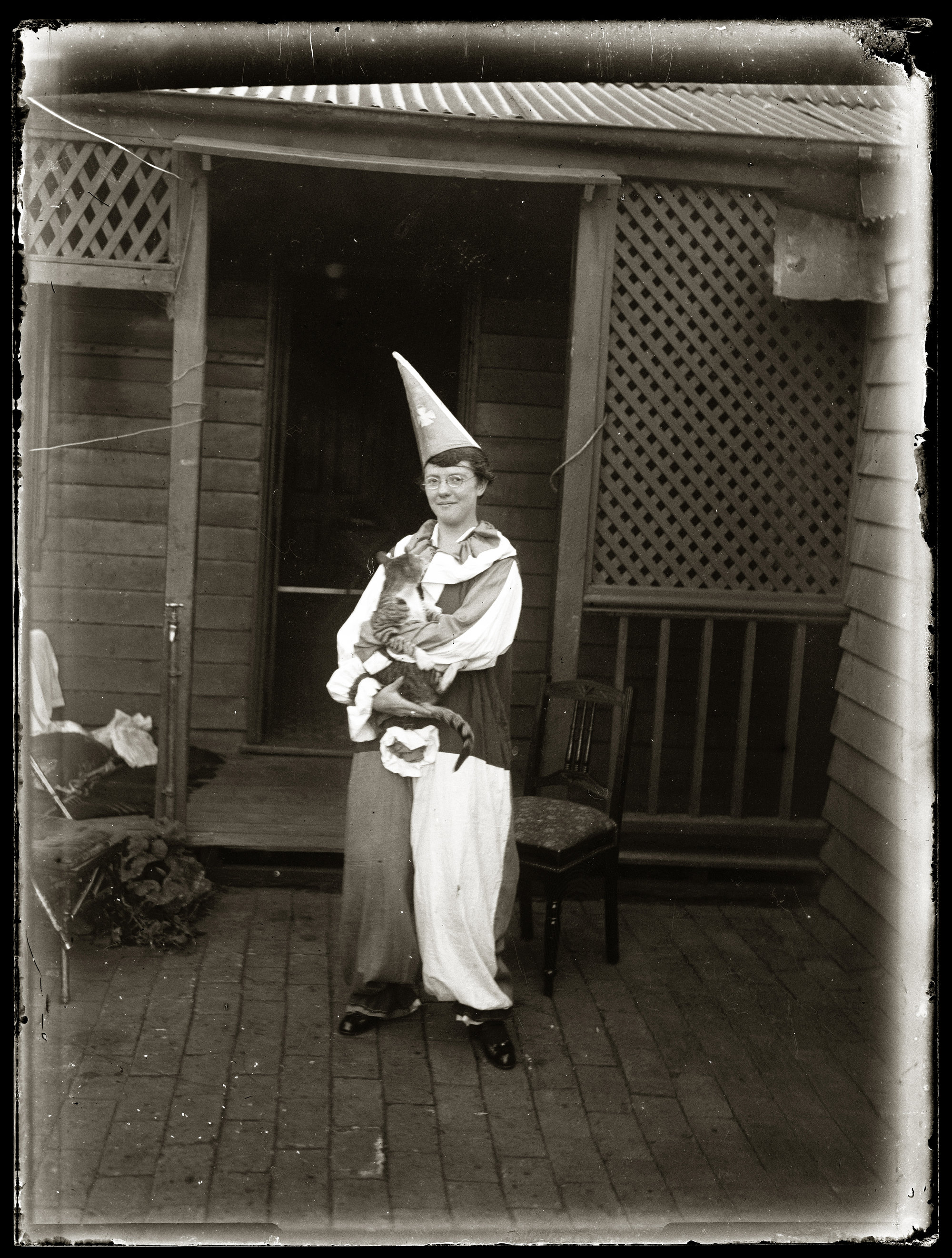 Woman dressed as a clown, with a cat, [ARODGN_0426]. Living Histories, accessed 17/04/2026, https://livinghistories.newcastle.edu.au/nodes/view/32577