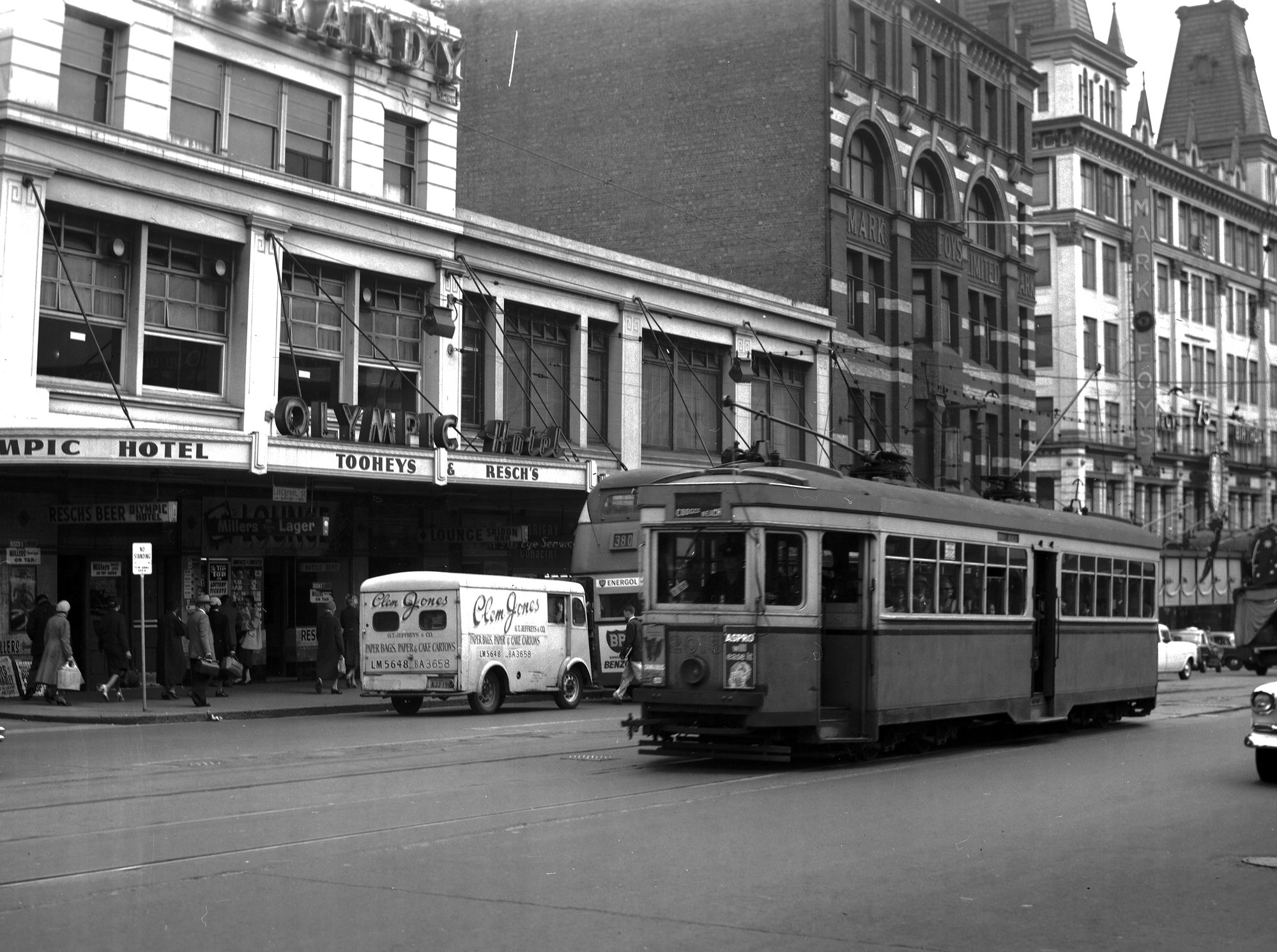 NSWGT R1 Class Tram, no. 2015, passing the Mark Foys building, Liverpool Street, Sydney, [1950s]